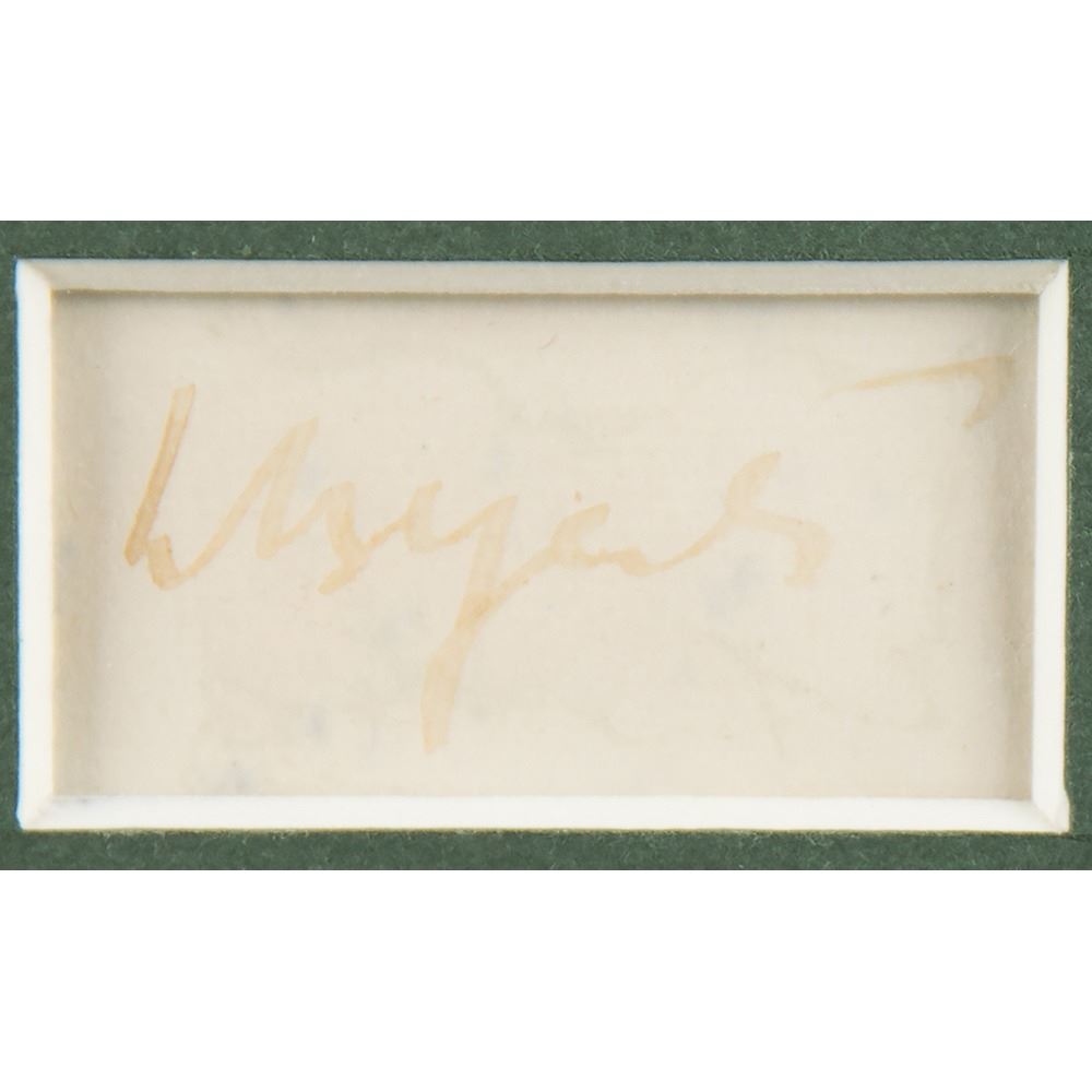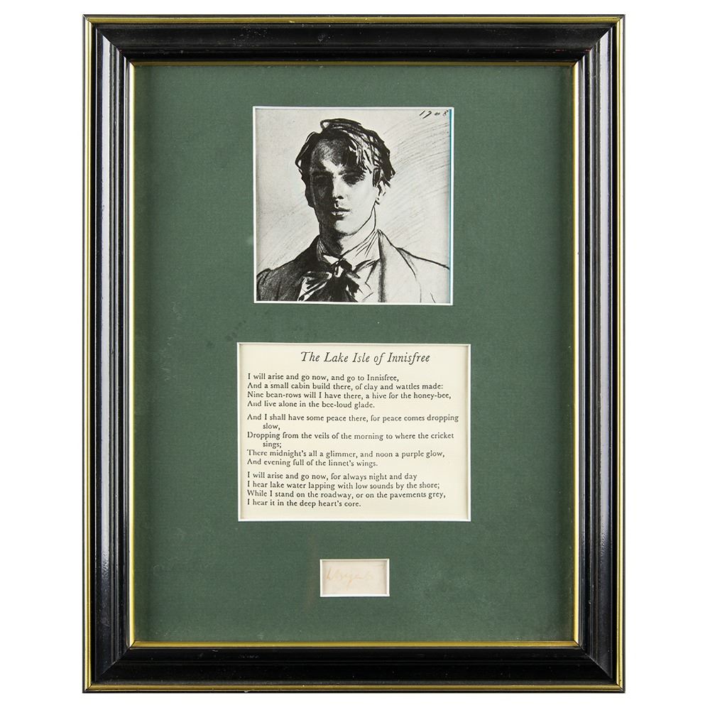 Vintage ink signature, "W. B. Yeats,” on an off-white 1.25 x .75 slip, matted and framed with a portrait and poem to an overall size of 10 x 12.5. In very good to fine condition, with the signature very faded, but still completely legible.
