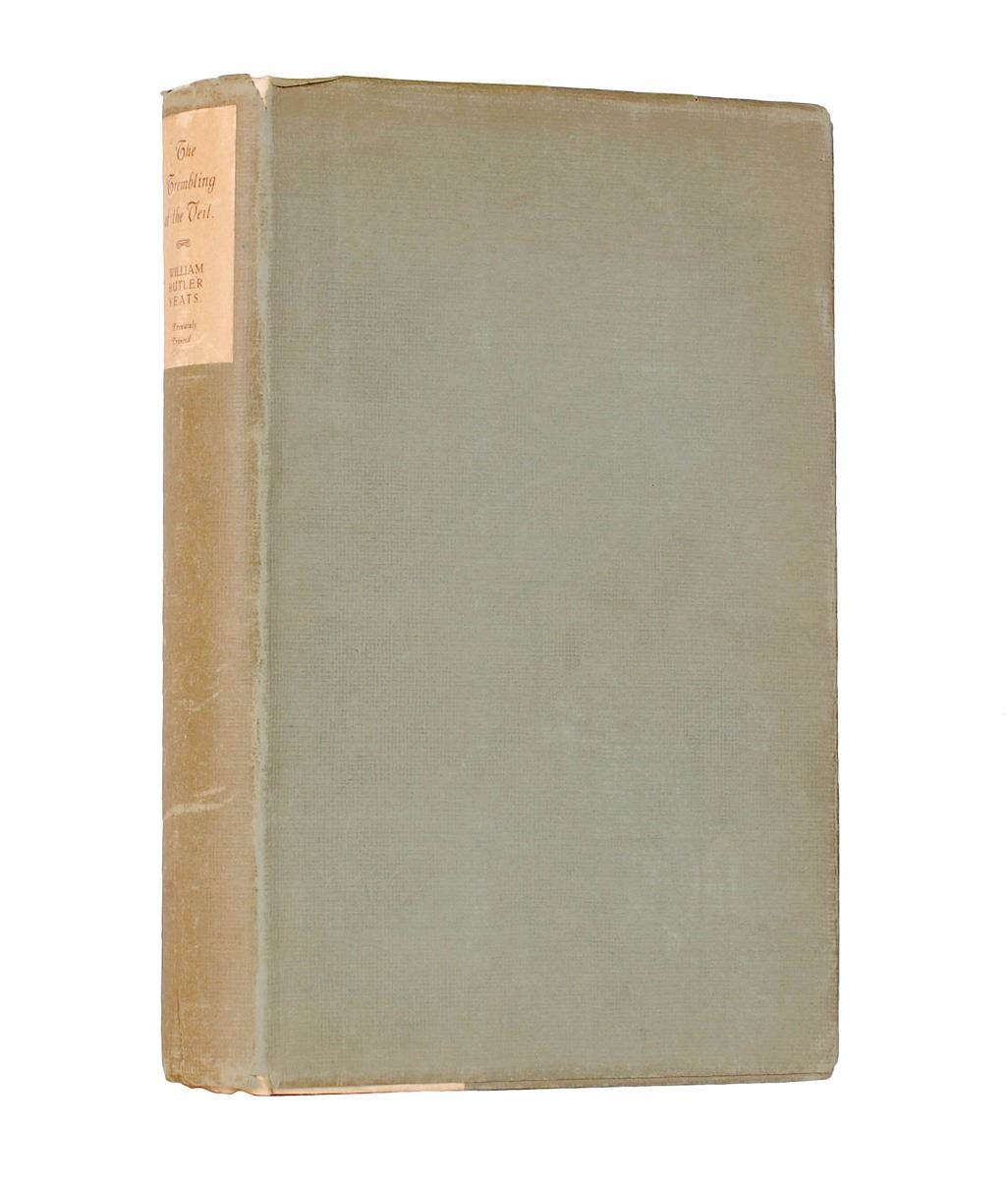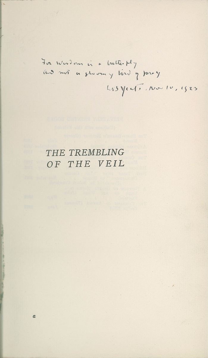 Signed book: The Trembling of the Veil. First edition, limited issue, numbered 792/1000. London: T. Werner Laurie, Ltd., 1922. Hardcover with dust jacket, 6 x 9, 247 pages. Signed on the half-title page in ink with an AQS, “For wisdom is a butterfly, and not a gloomy bird of prey, W. B. Yeats, Nov. 10, 1923,” and also signed on the colophon as issued, “W. B. Yeats.” Autographic condition: fine. Book condition: VG+/ VG. From Yeats’s poem ‘Tom O’Roughley,’ this quote came to represent to him the wisdom of age in contrast to youth; he often penned these lines of verse when signing books for admirers.
