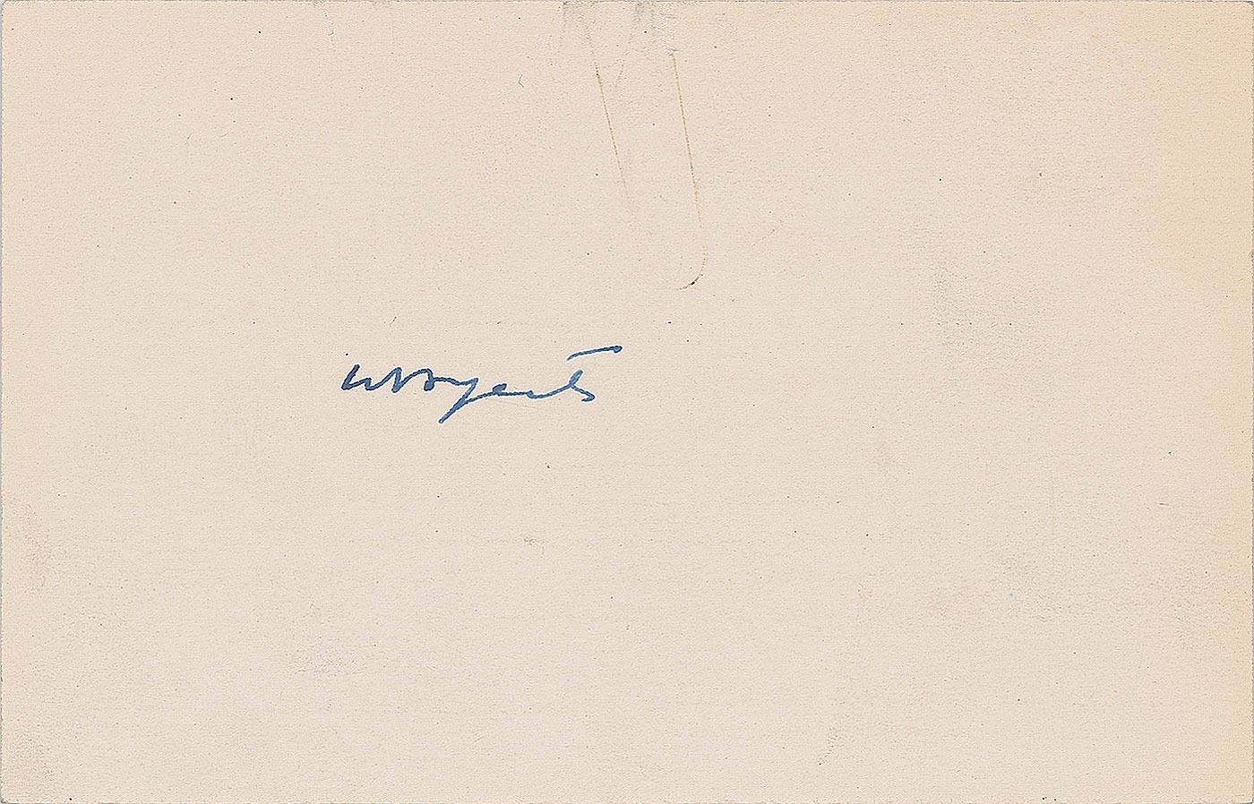 Desirable ink signature, "W. B. Yeats,” on the reverse of an off-white 5.5 x 3.5 Society of Arts and Sciences dues card. In fine condition, with a light paperclip impression to the top edge.