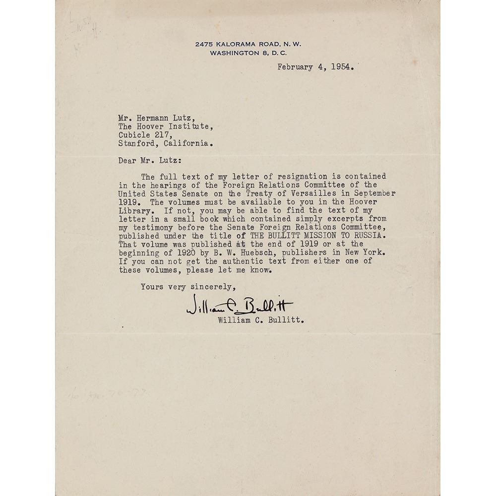 American diplomat, journalist, and novelist (1891–1967) known for his special mission to negotiate with Lenin on behalf of the Paris Peace Conference. TLS, one page, 8.5 x 11, personal letterhead, February 4, 1954. Letter to Hermann Lutz of the Hoover Institute, in full: "The full text of my letter of resignation is contained in the hearings of the Foreign Relations Committee of the United States Senate on the Treaty of Versailles in September 1919. The volumes must be available to you in the Hoover Library. If not, you may be able to find the text of my letter in a small book which contained the simply excerpts from my testimony before the Senate Foreign Relations Committee, published under the title of The Bullitt Mission to Russia. That volume was published at the end of 1919 or at the beginning of 1920 by B. W. Huebsch, publishers in New York. If you can not get the authentic text from either one of these volumes, please let me know." In fine condition.
