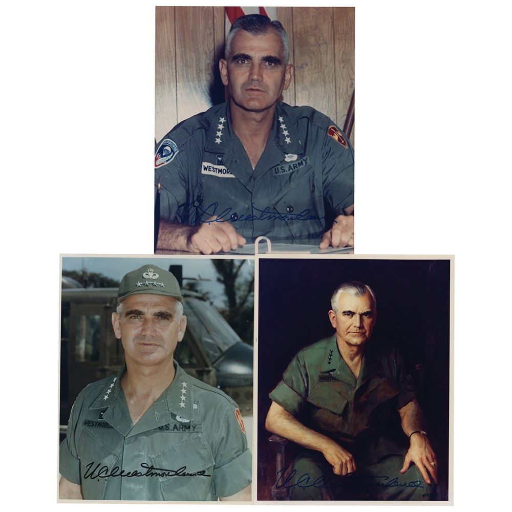 Three color 8 x 10 photos of Westmoreland in uniform, each signed in felt tip, "W. C. Westmoreland." In overall fine condition, with a vertical bend to the left edge of the artist's portrait image.