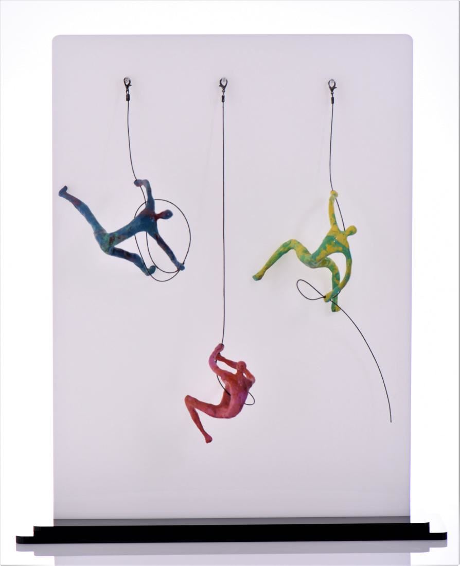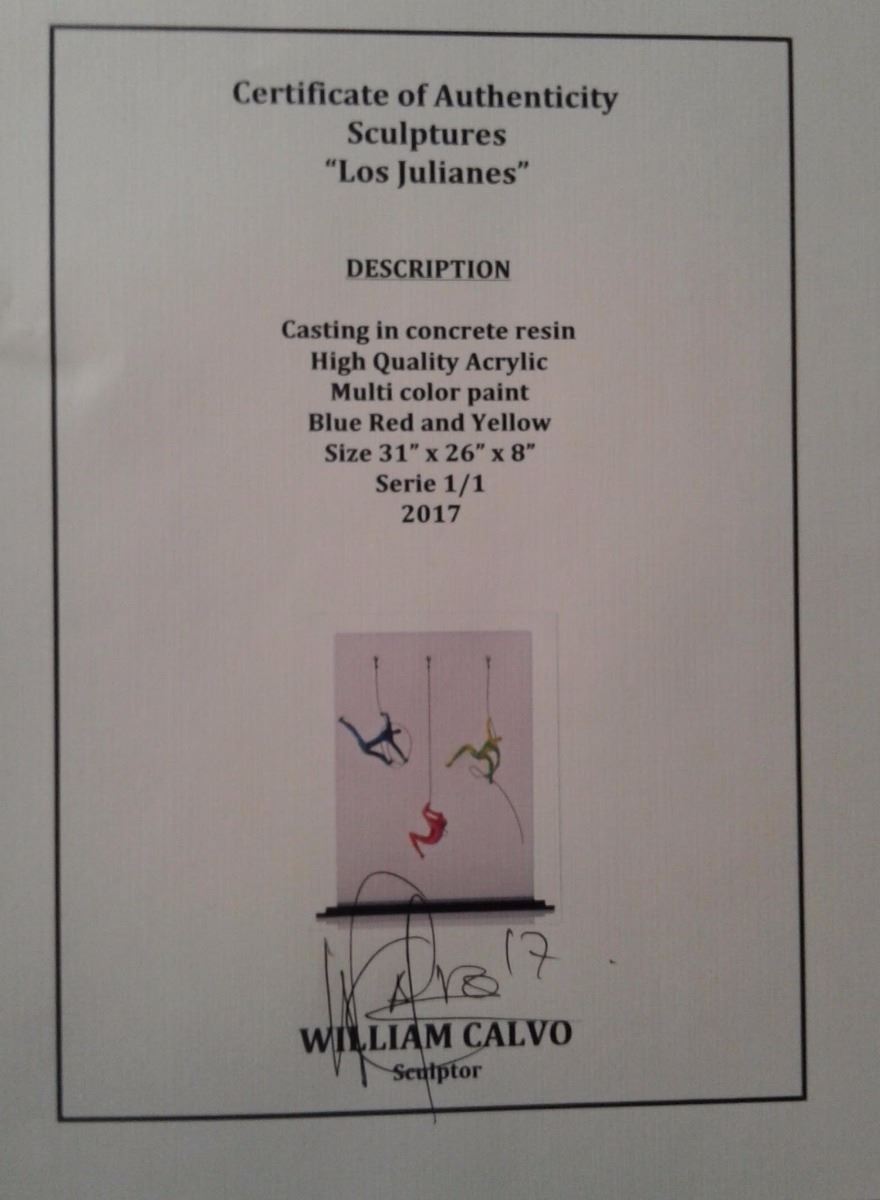 William Calvo "Los Julianes", 2017. An Original Artwork By Calvo Representing Rock Climbers Climbing A Cliff. This Art Was Created With Concrete Resin, High Quality Acrylic, And Multi Color Paint. Artist Signed With COA, Certificate of Authenticity. Size 31 inches x 26 inches x 8 inches. Calvo vows to give himself to the field of sculpture with his imagination creating artworks in a magical tour with his hands. Calvo extends from classic to modern styles, mixing these trends between human bodies, animals and geometric figures. He is drawn to nature and spirit wrapped within the real and the imaginary. Calvo indescribably captures the essence of life and gives life to these sculptures in major exhibitions across the world. Calvo has sold past works of art during Art Basel Miami and is scheduled to be there on exhibition in 2018. Estimated less than 50 yrs old. Contemporary art is art produced at the present period in time. Contemporary art includes, and develops from, postmodern art, which is itself a successor to modern art. (Wikipedia) (Photos Represent The Lot Condition.)