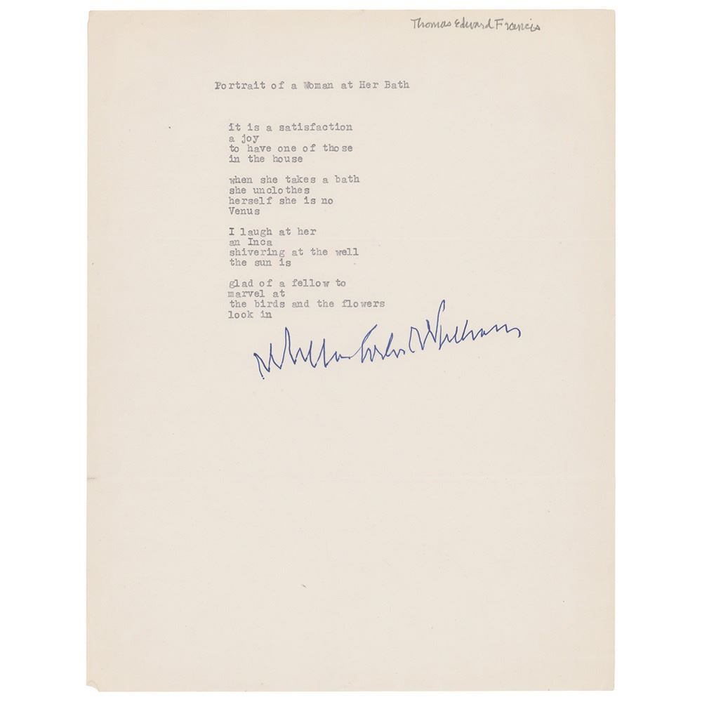 TQS on an off-white 8.5 x 11 sheet, boldly signed in blue ballpoint, "William Carlos Williams." The complete text of Williams's poem 'Portrait of a Woman at Her Bath,' in full: "It is a satisfaction / a joy / to have one of those / in the house. / when she takes a bath / she unclothes / herself she is no / Venus / I laugh at her / an Inca / shivering at the well / the sun is / glad of a fellow to / marvel at / the birds and flowers / look in." In fine condition.