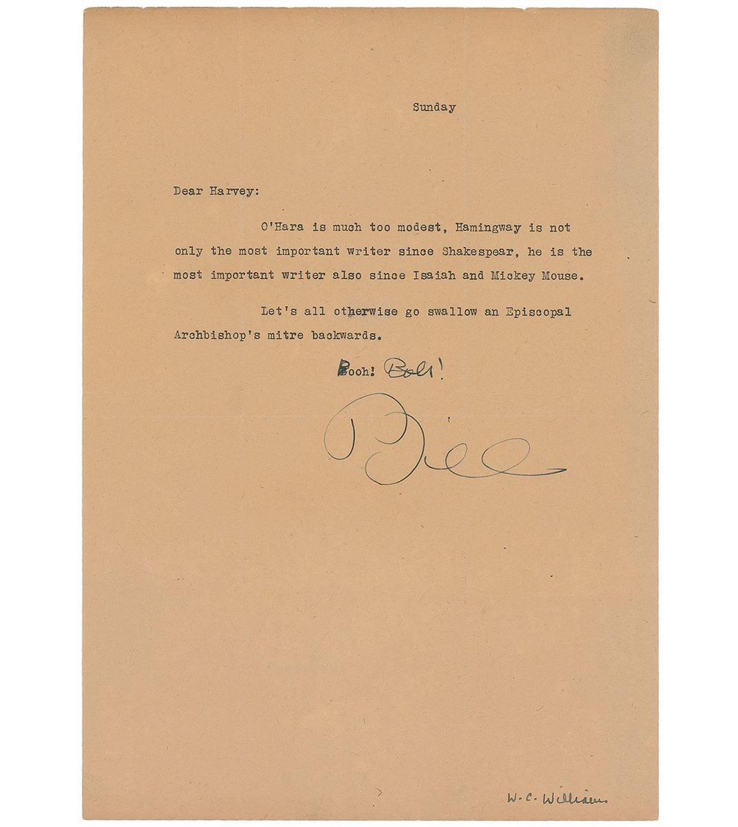 TLS signed “Bill,” one page, 8 x 11.25, no date. Letter to Harvey. In full: “O’Hara is much too modest, Hemingway is not only the most important writer since Shakespear [sic], he is the most important writer also since Isaiah and Mickey Mouse. Let’s all otherwise go swallow an Episcopal Archbishop’s mitre backwards.” In fine condition, with intersecting folds (one vertical fold passing through a single letter of the signature) and trivial tears to top edge.
