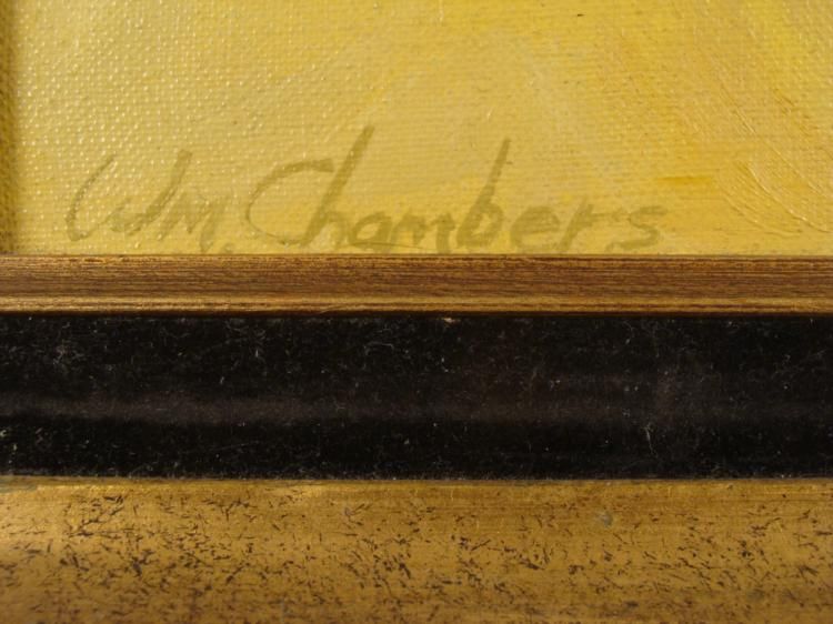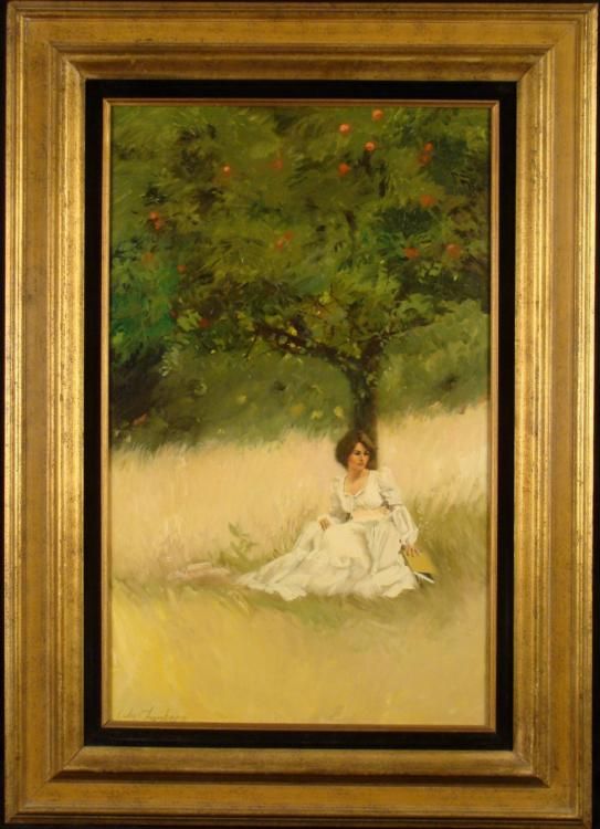 This is an original painting of a beautiful woman in white, resting against a tree in a soft, lush meadow. This still life was completed by the artist when he was in China doing plein-aire painting studies on location. * * Artist: William ChambersSignature: Signed in silver paint by the artist Title: Morning In The MeadowMedium: Oil on canvas Image size is 17 x 27 inchesFraming: In gold painted decorative wood frameFrame size: 25 1/4 x 35 1/4 inches * Condition: Excellent -brought directly to us by the artist * * Biography * Born in 1940 and raised in the Chicago area, Chambers first began his studies at the University of Illinois He planned on majoring in industrial design, but after realizing the field required more engineering than he had initially thought. and desiring to be an artist more than an engineer, he transferred to Northeastern Illinois University earning a Bachelors of Arts Degree. From there he began his studies and graduated from the American Academy of Art in Chicago. * After graduation from the American Academy, he apprenticed for several years at Magee Inc. a top illustration studio. He continued his career as an illustrator working at another Jack O'Grady studios in Chicago. While working in illustration he became more engrossed in portrait painting. * By 1979, he decided to strike out on his own as a portrait painter. Many people took notice of his painting, and before long, he was approached by a consultant for the Knowles China Company. * Chambers had never heard of collector plates at that time, but he quickly became a design star, appearing on the cover of Plate World magazine and making appearances across the country. He is a Master Signature Member in a group of only 25 artists. * Although popular for his successes in the realm of collector plates, Chambers is best known for his expertise as a portrait artist. His large commissioned works are priced from $25,000 to $35,000. *