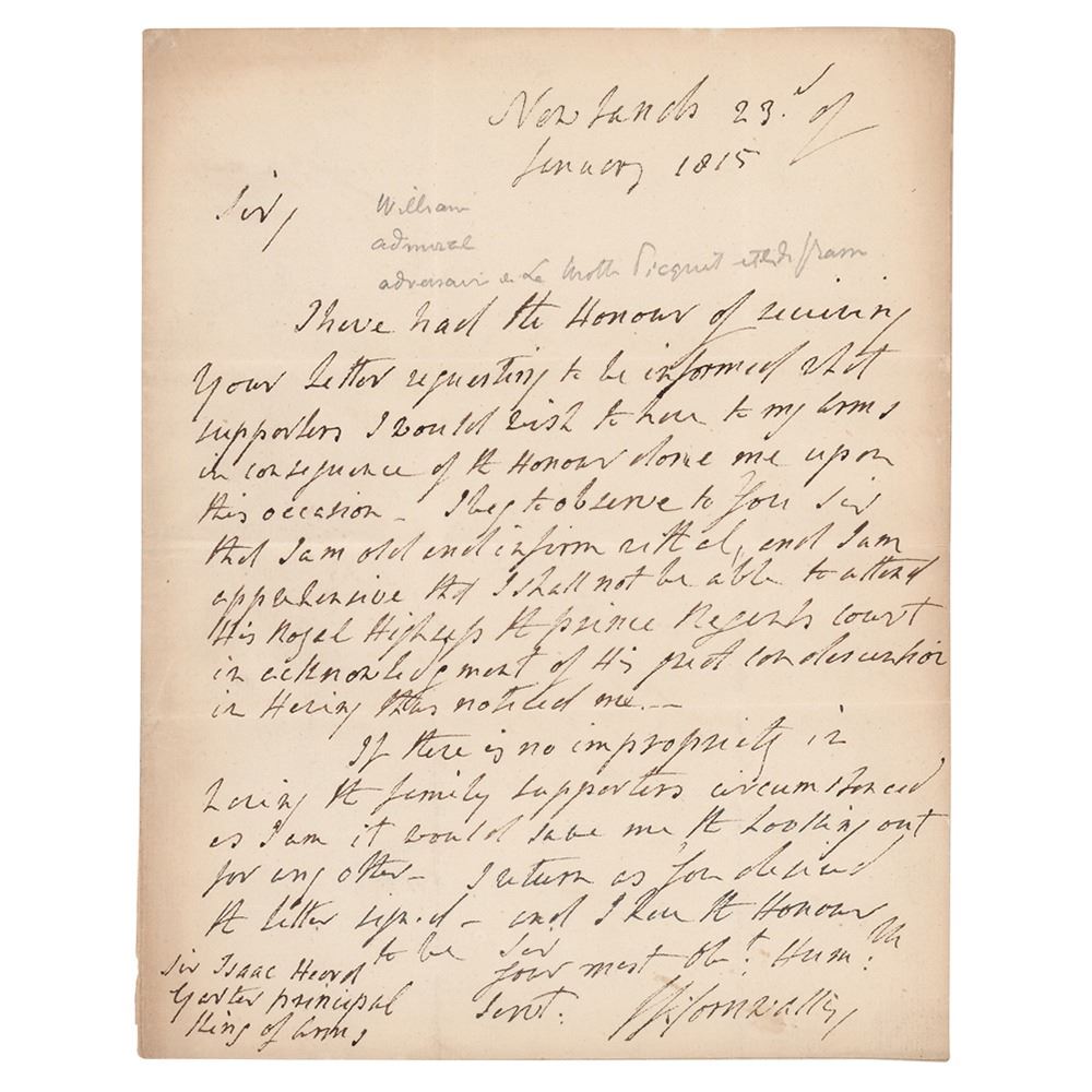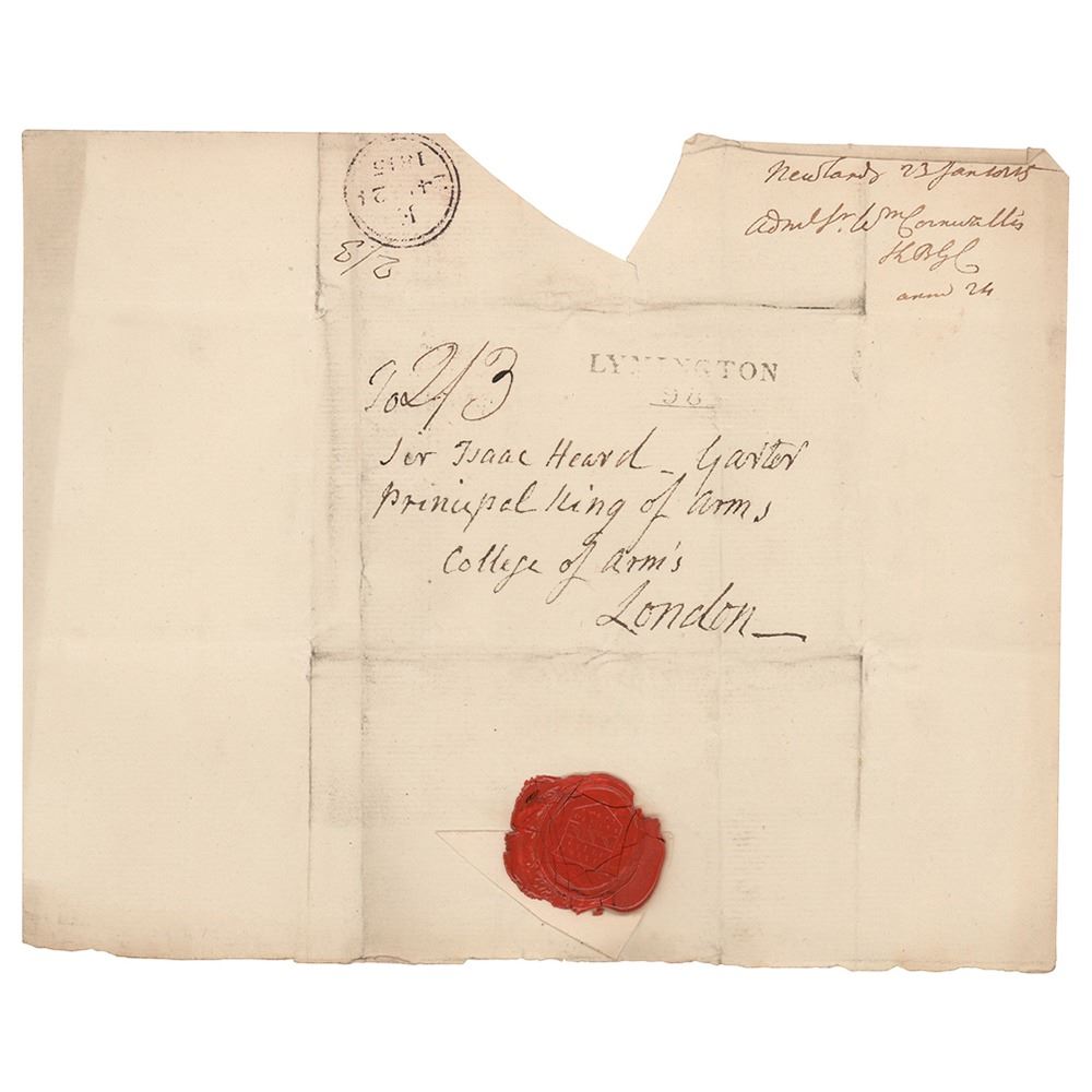 ALS signed “W. Cornwallis,†one page, 7.25 x 9.5, January 23, 1815. Handwritten letter to Isaac Heard, Garter Principal King of Arms, upon being made a Knight Grand Cross of the Order of the Bath. In part: "I have had the Honour of receiving your Letter requesting to be informed what supporters I would wish to have to my arms in consequence of the Honour done me upon this occasion. I be to observe to you Sir that I am old and infirm…I am apprehensive that I shall not be able to attend His Royal Highness the Prince Regent's Court…If there is no impropriety in having the family supporters circumstanced as I am it would save me the looking out for any other." In fine condition. Accompanied by the original address panel, accomplished in Cornwallis's own hand.