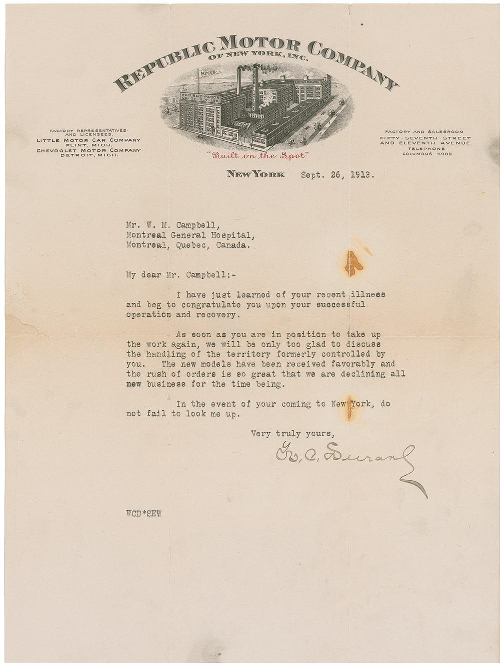 Leading pioneer of the United States automobile industry, the founder of General Motors and Chevrolet who created the system of multi-brand holding companies with different lines of cars. TLS signed “W. C. Durant,” one page, 8.25 x 11, Republic Motor Company letterhead, September 26, 1913. Durant writes W. M. Campbell at Montreal General Hospital in Canada. In part: “I have just learned of your recent illness and beg to congratulate you upon your successful operation and recovery. As soon as you are in position to take up the work again, we will be only too glad to discuss the handling of the territory formerly controlled by you. The new models have been received favorably and the rush of orders is so great that we are declining all new business for the time being.” Intersecting folds with a vertical fold through his name, small tear along the left edge, wrinkling, a couple spots of mild toning and soiling, otherwise very good condition. Great automotive content.