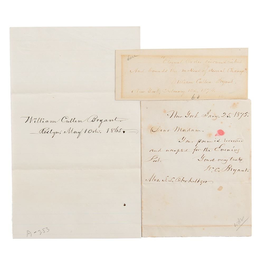 Three items signed by the romantic poet and journalist: a bold ink signature, "William Cullen Bryant, Roslyn, May 10th 1865," on an off-white 5 x 8 sheet; an AQS on an off-white 5 x 2 card: "'Eternal order circumscribes and bounds the motions of eternal change,' William Cullen Bryant, New York, February 10th 1874"; and an ALS signed "W. C. Bryant," one page, 4 x 5.25, January 25, 1875, in full: "Your poem is received and accepted for the Evening Post." In overall very good to fine condition, with toning to the AQS and scattered staining to the letter.