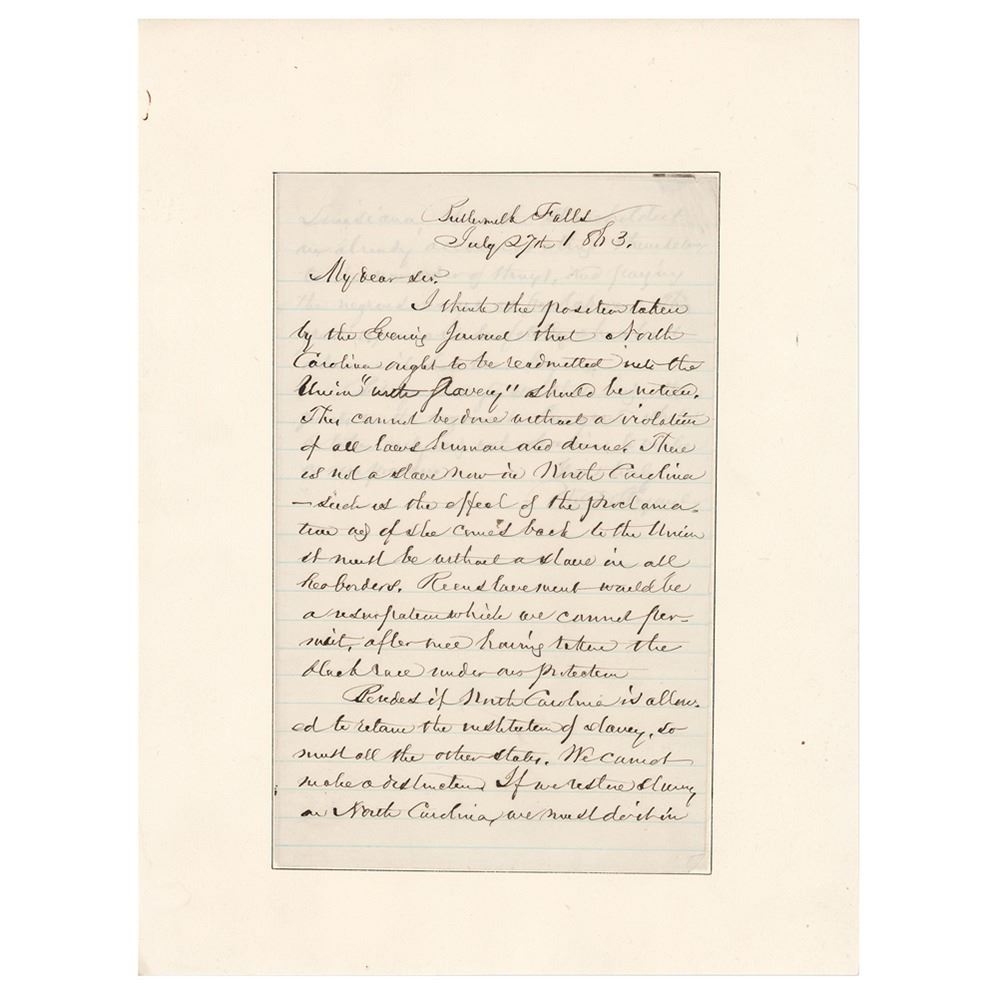 ALS signed W. C. Bryant, two pages on two adjoining sheets, 5 x 8, July 27, 1863. Handwritten letter to a gentleman, in part: "I think the position taken by the Evening Journal that North Carolina ought to be readmitted into the Union 'with Slavery' should be noticed. This cannot be done without a violation of all laws human and divine. There is not a slave now in North Carolinasuch is the effect of the proclamation as if she comes back to the Union it would be without a slave in all her borders. Reenslavement would be a usurpation which we cannot permithaving taken the black race under our protection. Besides if North Carolina is allowed to retain the institution of slavery, so must all the other states. We cannot make a distinction. If we restore slavery in North Carolina, we must do it in Louisiana, where the slaveholders are already accommodating themselves to the new order of thought, and paying the negroes wages as free laborers. This great reform will be fatally checked wherever it had been begun." Professionally inlaid into a larger sheet and in fine condition. A fascinating letter by the abolitionist poet on the rights of man and the effects of President Abraham Lincoln's Emancipation Proclamation, issued on January 1, 1863.