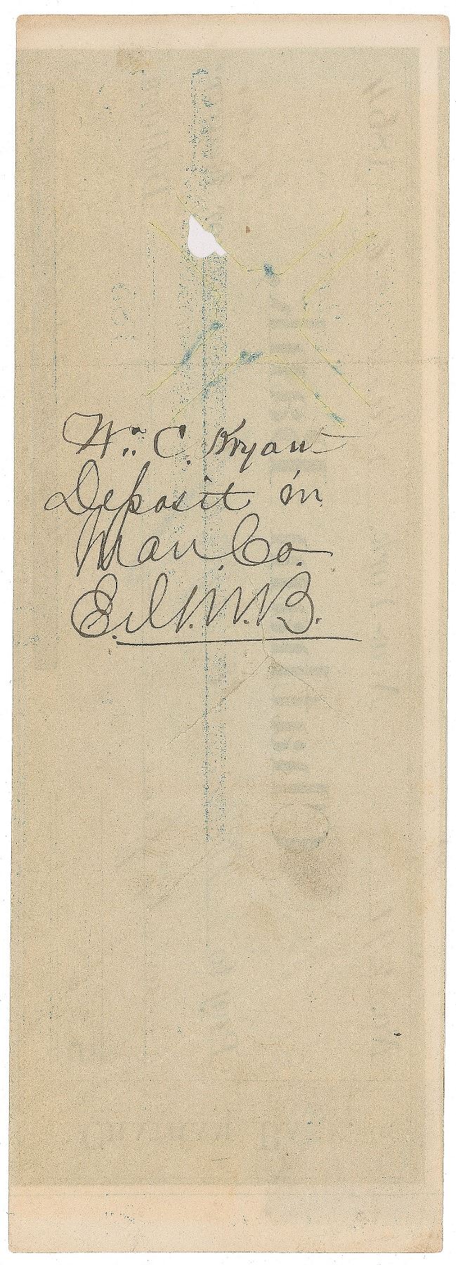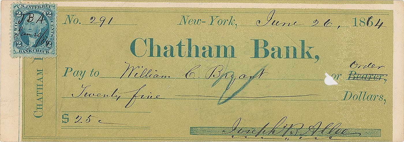 Chatham Bank check, 7.25 x 2.5, filled out in another hand and made payable to William Cullen Bryant for $25, June 26, 1864, endorsed on the reverse in black ink, "W. C. Bryant." In fine condition. Only the third signed Bryant check we have ever offered.