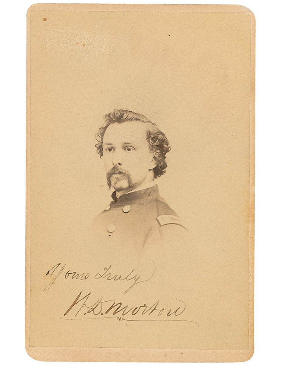 Major in the 14th New York Cavalry. Original 2.5 x 4 carte-de-visite bust photo by William Klauser of New York, signed below the image in black ink, “Yours truly, W. D. Morton.” In fine condition, with pencil notations on reverse.