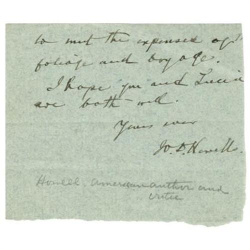 <B>William Dean Howells Partial Note Signed,</B></I> 4 x 3.25, clipped. Howells (1837 -1920) was an American realist author and literary critic. His literary reputation took off with the realist novel <I>A Modern Instance,</B></I> published in 1882, which described the decay of a marriage. His 1885 novel<I> The Rise of Silas Lapham</B></I> is perhaps his best known, describing the rise and fall of an American entrepreneur in the paint business. Fine. <I>From the collection of Henry E. Luhrs</B></I> <BR><BR><b>Shipping:</b> Flat Material, Small (<a target="_blank" href="http://www.heritageauctions.com/common/shipping.php">view shipping information</a>)