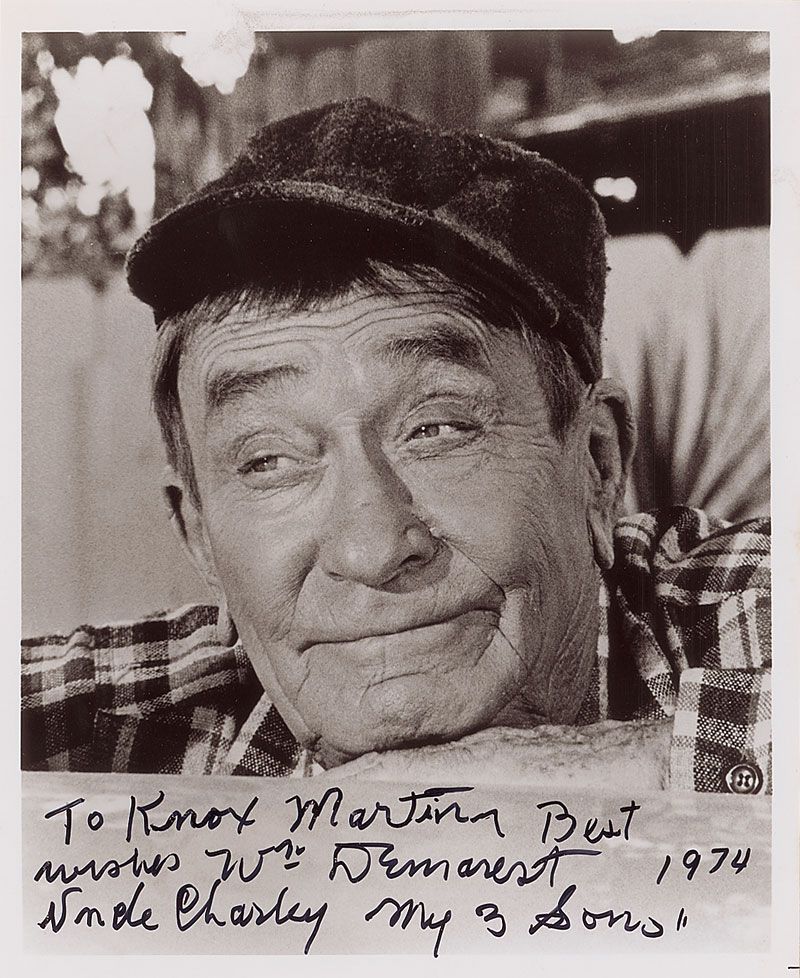 Durable American character actor (1892–1983) best known for his role as Uncle Charlie on the popular 1960s sitcom My Three Sons. Glossy 8 x 10 close-up photo, signed and inscribed in black felt tip “To Knox Martin, Best wishes Wm Demarest Uncle Charley My 3 Sons.” In fine condition.