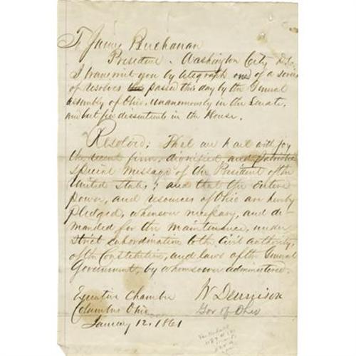 <B>William Dennison Autograph Letter Signed</B></I> 6.5” x 10”, January 12, 1861, Columbus, Ohio. The letter is to President James Buchanan pledging “<I>the entire power, and resources of Ohio … for the maintenance … of the Constitution, and laws of the General Government</B></I>”. Dennison (1815-1882) served as the 24th Governor of Ohio. In the early days of the succession crisis, Dennison mobilized Ohio troops and dispatched them to the Federal government. Later, he would served as U.S. Postmaster General in the Cabinet of President Abraham Lincoln during the American Civil War. Folds and some slight staining, else near very good. <I>From the collection of Henry E. Luhrs.</B></I><BR><BR><BR><b>Shipping:</b> Flat Material, Small (<a target="_blank" href="http://www.heritageauctions.com/common/shipping.php">view shipping information</a>)