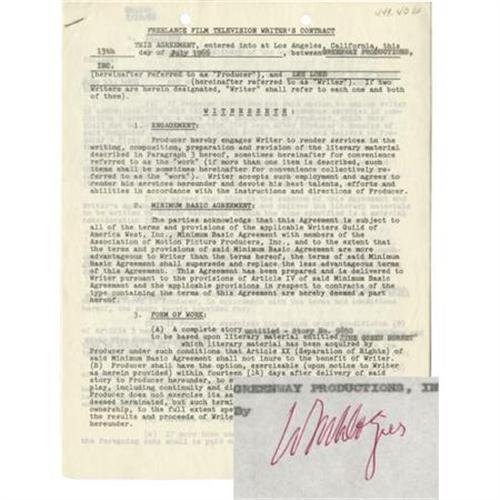 <B>William Dozier Signed "Green Hornet" Contract.</B></I> A six-page freelance film and television writer's contract between William Dozier's Greenway Productions and writer Lee Loeb for work on the <I>Green Hornet</B></I> TV series, dated July 13, 1966, and signed by Dozier on the last page in purple ink. A rare signature from Dozier, who served as a producer and narrator for both the <I>Green Hornet</B></I> and <I>Batman</B></I> TV series. In Very Fine to Excellent condition with minor toning and wear, and the usual staple and binder holes to the top edge. <I>Accompanied by a certificate of authenticity.</B></I> <I>Accompanied by LOA from PSA/DNA.</B></I><BR><BR><b>Shipping:</b> Flat Material, Small (<a target="_blank" href="http://www.heritageauctions.com/common/shipping.php">view shipping information</a>)