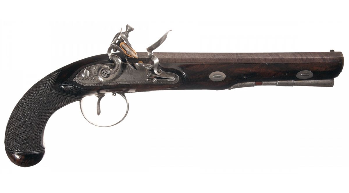 Condition: Very good. The barrel retains strong traces of the Damascus pattern with a smooth gray patina. The remaining metal surfaces have bright appearance. There is some fine pin point pitting (mostly on the barrel). The stock is excellent with some minor handling marks and a few blemishes in the overall crisp checkering. Mechanically excellent.