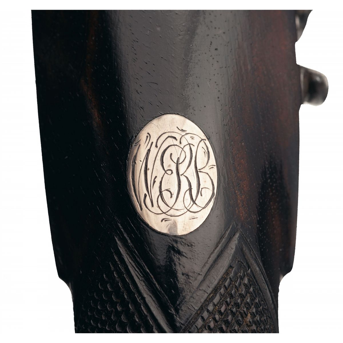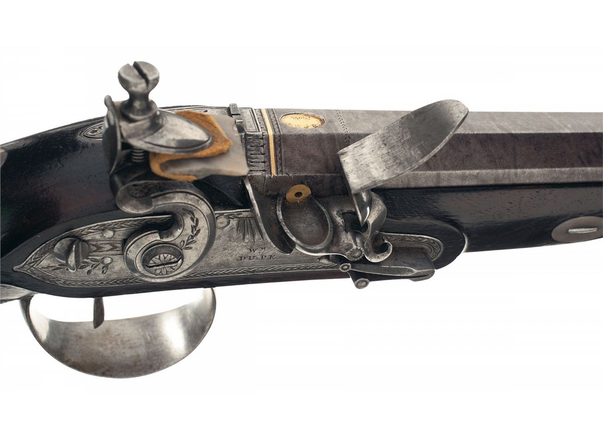 The border engraved lock plate is marked "WM/DUPE" and the top barrel flat has a gold highlighted "Dupe" proof with a gold inlaid band at the breech. IEngraved trigger guard, sliding safety and set trigger. The stock has a checkered grip area and a monogrammed silver initial oval.