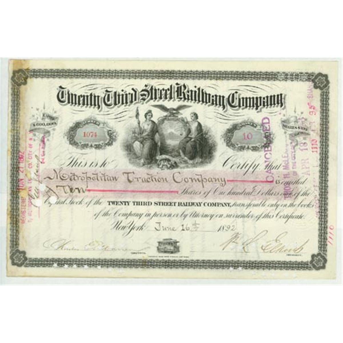 William Elkins. DS. 1pp. 10 3/4" x 7". New York. 1892. A "Twenty Third Street Railway Company" stock signed by William Elkins as president. Top center engraving of two allegorical women. Lightly punch cancelled, including through the dark signature, but in fine condition overall. Light glue stains to the left edge affect little.