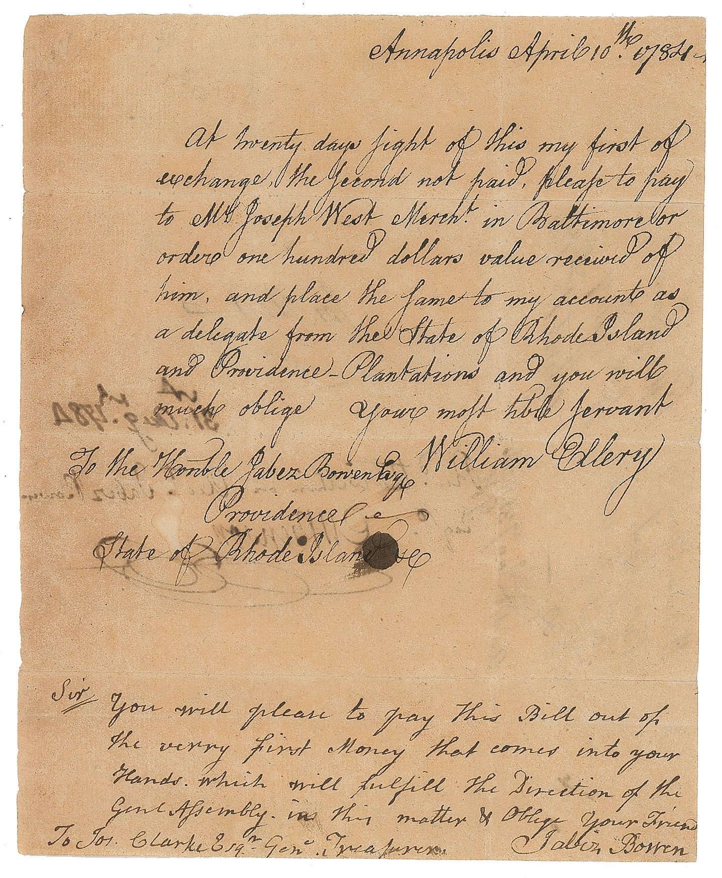 DS, one page, 6 x 7.25, April 10, 1784. Bill of exchange issued to Deputy Governor of Rhode Island Jabez Bowen: "At twenty days sight of this my first of exchange the second not paid, please to pay to Mr. Joseph West Merch't in Baltimore or order one hundred dollars value received of him, and place the same to my accounts as a delegate from the State of Rhode Island and Providence—Plantations and you will much oblige." Signed at the conclusion by William Ellery, with lower portion featuring a signed handwritten note from Bowen, who requests that the bill will be paid "out of the verry first money that comes into your hands." In fine condition.