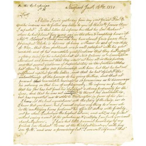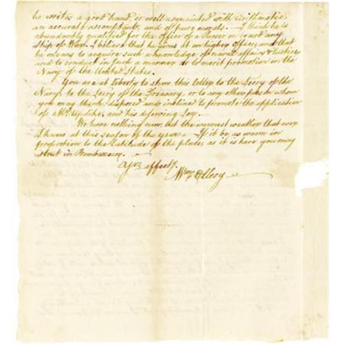 <B>William Ellery Autograph Letter Signed</B></I> <I>"Wm Ellery,"</B></I> 1.5 pages, 6.5" x 8", front and verso. Newport, January 16, 1810. Integral leaf addressed by Ellery to <I>"The Honble/William Stedman/in Congress/City of Washington,"</B></I> franked <I>"Free"</B></I> in upper right. In part, <I>"A letter I rec'd yesterday from my good friend Danl. E. Updike induces me to follow my letter to you of the 14th sooner than I expected. In that letter he informs me that his Son Richard whom he had placed five years ago in the store & competing house of Messrs Blodget & Powers of Providence and who has been almost four years their principal Clerk, is desirous of being a Purser in and of our ships of War…they had expressed a strong desire for his establishment at New Orleans as a Commission Merchant and promised that they would aid him all in their powers…He informs me that his son has had from his childhood a strong propensity for the Seas, and that he was not disposed to thwart his inclination, but has requested me to write to Washington in favor of his Son. I have not the least acquaintance with the Secretary of the Navy Paul Hamilton of South Carolina nor do I know that you have; but I cannot refuse anything to a man who in the most trying times performed his official duties with fidelity and fir whom I entertain the highest esteem…I have but little personal knowledge of my friends son Richard. He was at the Wickford Academy with my son G.W. and was a promising lad. I am well informed that he writes a good hand, is well acquainted with arithmetic, an accurate accomptant, and of pure morals. I think he is abundantly qualified for the Office of a Purser on board any Ship of War…You are at liberty to show this letter to the Secretary of the Navy, to the Secretary of the Treasury Albert Gallatin , or to any other person whom you may think disposed and inclined to promote the application of Mr. Updike, and his deserving Son."</B></I> As Massachusetts Congressman William Stedman had married Ellery's daughter Almy in 1790, Ellery ends this letter, <I>"Yrs affect ionatel y."</B></I> William Ellery, a signer of the Declaration of Independence, was collector of the port of Newport, Rhode Island, from 1790 until his death in 1820. It is not known if Richard Updike was ever appointed, but in 1790, a "Daniel E.Updike" had been appointed by President Washington to be surveyor of the port of North Kingstown, Rhode Island. There are two seal tears on the integral address leaf, one extending into the blank left margin of the letter which is tipped to an 8.5" x 10.5" sheet. Lightly stained, the letter is in fine condition.<BR><BR><b>Shipping:</b> Flat Material, Small (<a target="_blank" href="http://www.heritageauctions.com/common/shipping.php">view shipping information</a>)