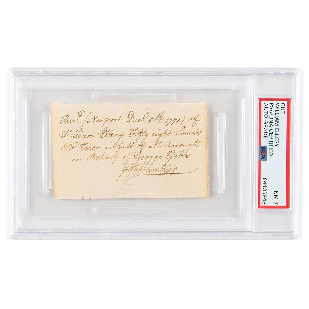 Third-person ADS by William Ellery, who has signed within the text, one page, 3.75 x 2.25, December 5, 1771. Payment receipt, in full: "Rec'd Newport Dec. 5th 1771, of William Ellery Fifty eight Pounds Old Tenor in full of all Accounts in Behalf of George Gibbs." Signed at the conclusion by G. G. Champlin. In fine condition. Encapsulated in a PSA/DNA authentication holder, grading the autograph as "NM 7."