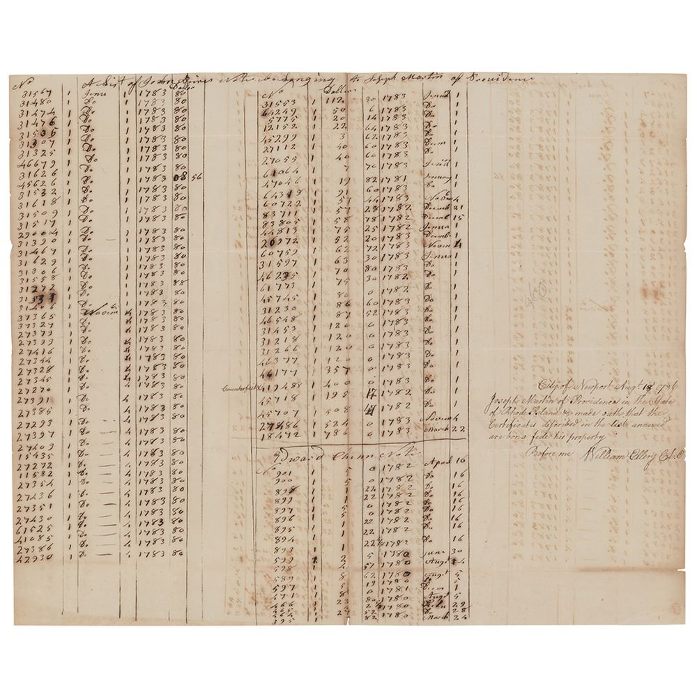 Manuscript DS, signed ‰ÛÏWilliam Ellery C.L.O.,‰Û one page, 15.5 x 12.75, August 18, 1786. Ledger document recording notes belonging to Joseph Martin of Providence, with a handwritten and signed endorsement in the margin by Ellery as Commissioner of the Continental Loan Office: "City of Newport, Aug't 18, 1786, Joseph Martin of Providence in the State of Rhode Island &c made oath that the certificates described in the list annexed are bona fide his property. Before me, William Ellery C.L.O." In fine condition.