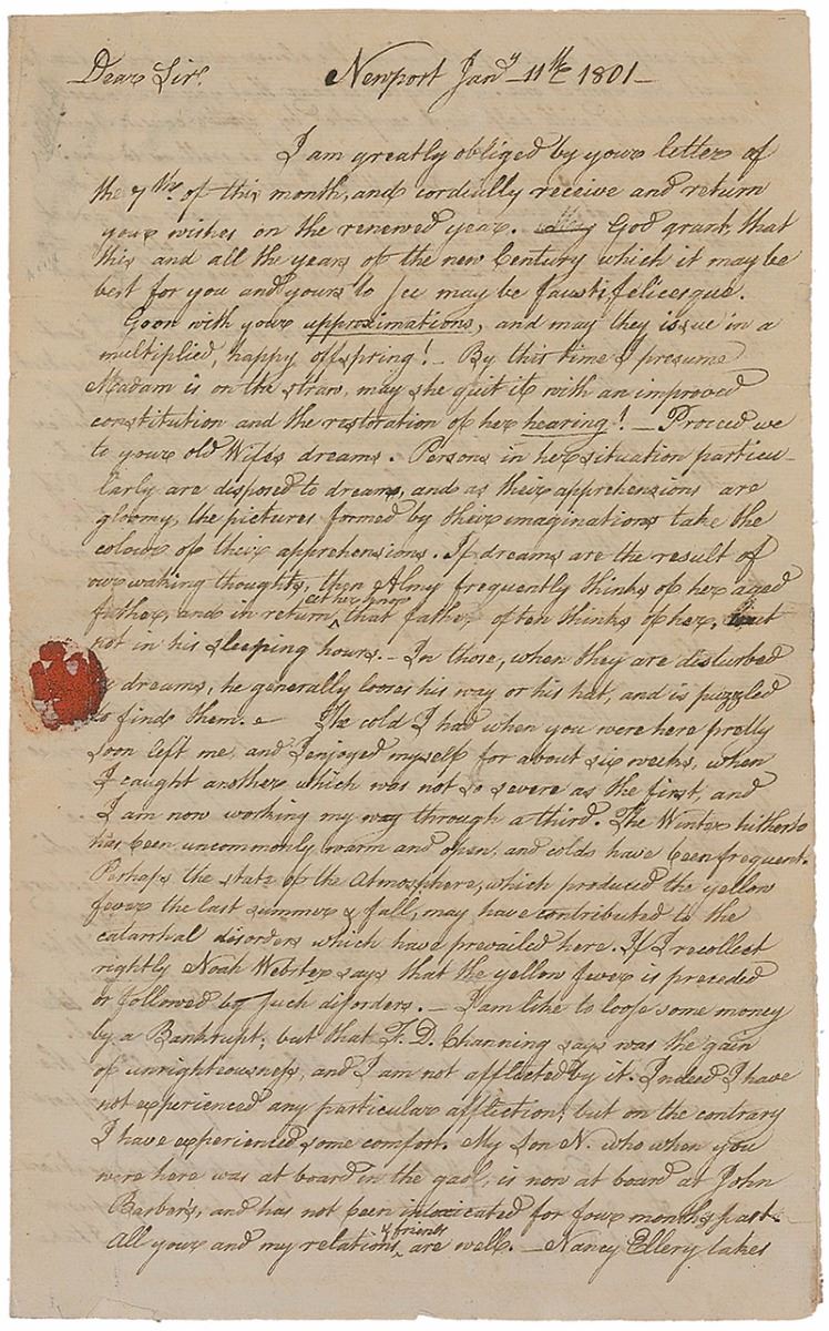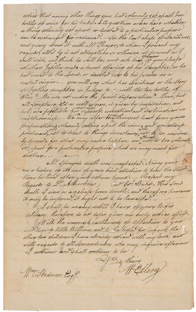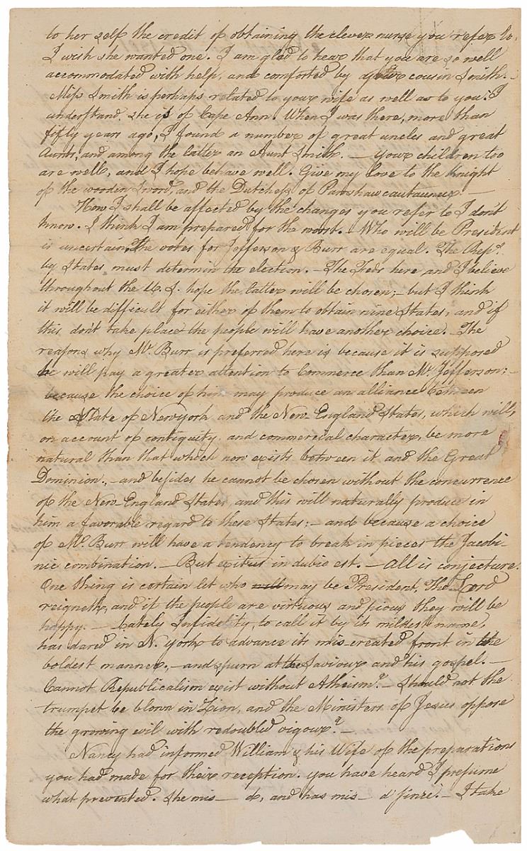 ALS signed “W. Ellery,” three pages on two adjoining sheets, 7.25 x 12, January 11, 1801. Letter to William Stedman of Massachusetts, in part: “Who will be President is uncertain. The votes for Jefferson & Burr are equal. The Rep's by States must determine the election. The Feds here and I believe throughout the U.S. hope the latter will be chosen;—but I think it will be difficult for either of them to obtain nine States, and if this don't take place the people will have another choice. The reasons why Mr. Burr is preferred here is because it is supposed he will pay a greater attention to Commerce than Mr. Jefferson; because the choice of his may produce an alliance between the State of New York and the New England States, which will on account of contiguity and commercial characters be more natural than that which now exists between it and the Great Dominion, and besides he cannot be chosen without the concurrence of the New England States, and this will naturally produce in him a favorable regard to these States…But exitus in dubio est.—All is conjecture. One thing is certain let who may be President, the Lord reigneth, and if the people are virtuous and pious they will be happy.” In very good to fine condition, with archival tape repairs to folds, and a few small areas of paper loss.