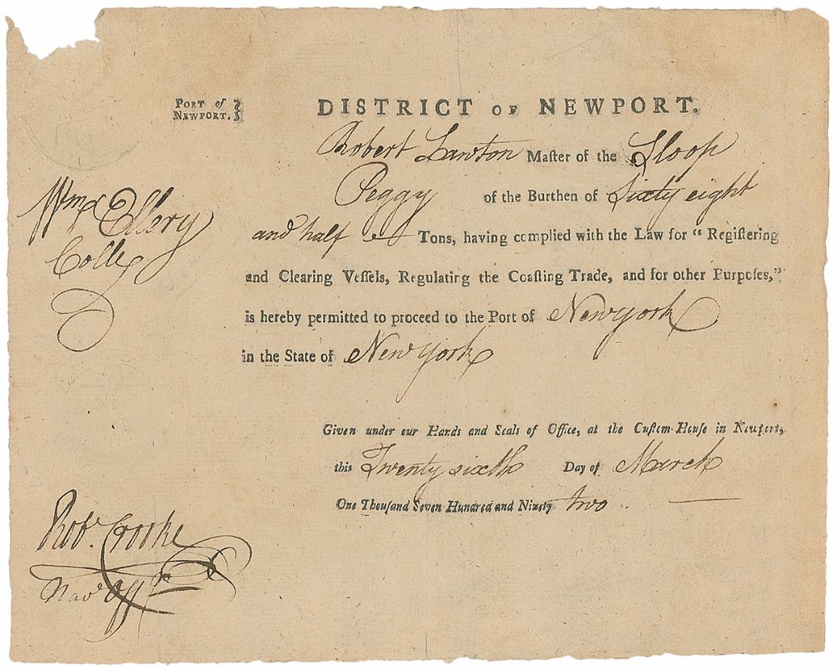 Signer of the Declaration of Independence from Rhode Island (1727–1820). Partly-printed DS, signed “Wm. Ellery, Colle.,” one page, 8.25 x 6.5, March 26, 1792. District of Newport document issued by Ellery as collector of customs, in part: “Robert Lawton Master of the Sloop Peggy of the Burthen of Sixty eight and half Tons, having complied with the Law for ‘Registering and Clearing Vessels, Regulating the Coasting Trade, and for other Purposes,’ is hereby permitted to proceed to the Port of New York.” Signed below an embossed seal in the left margin by Ellery and countersigned by “Rob. Cooke.” Small edge separations to intersecting folds, a bit of paper loss to upper left, and a slit to a portion of the embossed seal, otherwise fine condition.