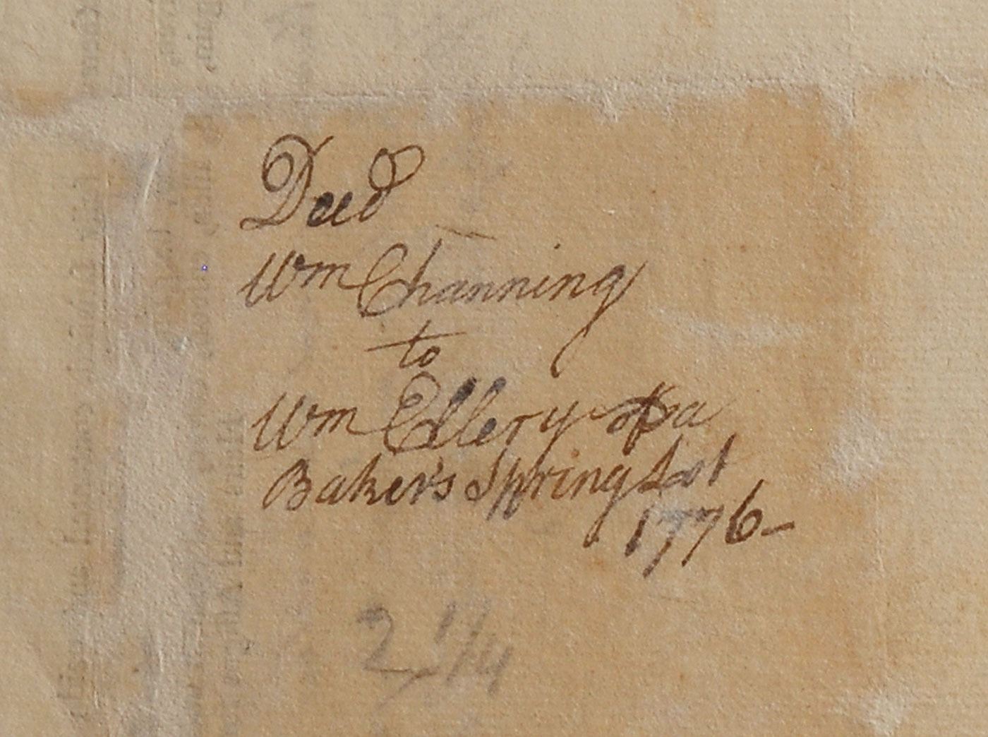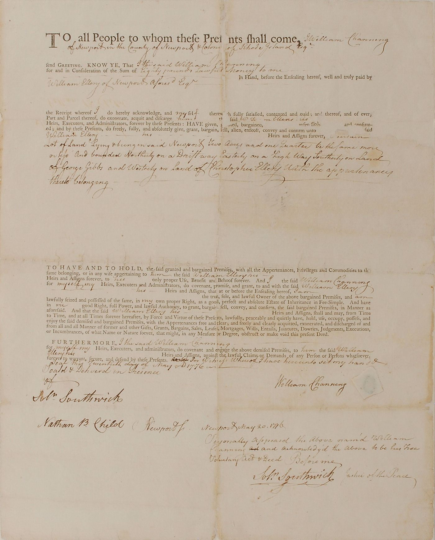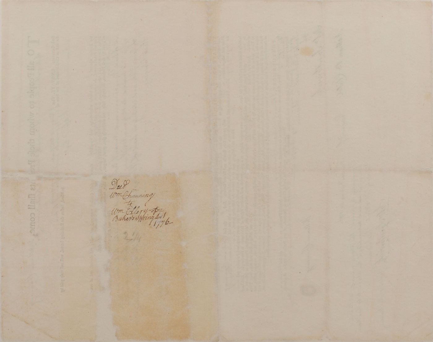 Autograph endorsement, signed "Wm. Ellery," on the reverse of a partly-printed document, one page, 13 x 16.75, May 20, 1776. Deed for land in Newport, in part: "William Channing for and in consideration of the sum of eighty pounds lawful money to me…well and truly paid by William Ellery of Newport…convey and confirm unto said William Ellery…two acres and one quarter be the same more or less and bounded Northerly on a driftway Easterly on a highway Southerlay on land of George Gibbs and Westerly on the land of Christopher Ellery." Ellery's endorsement appears on the reverse, in part: "Deed, Wm. Channing to Wm. Ellery…1776." In very good condition, with extensive professional repairs and restoration to areas of paper loss of fold separations.