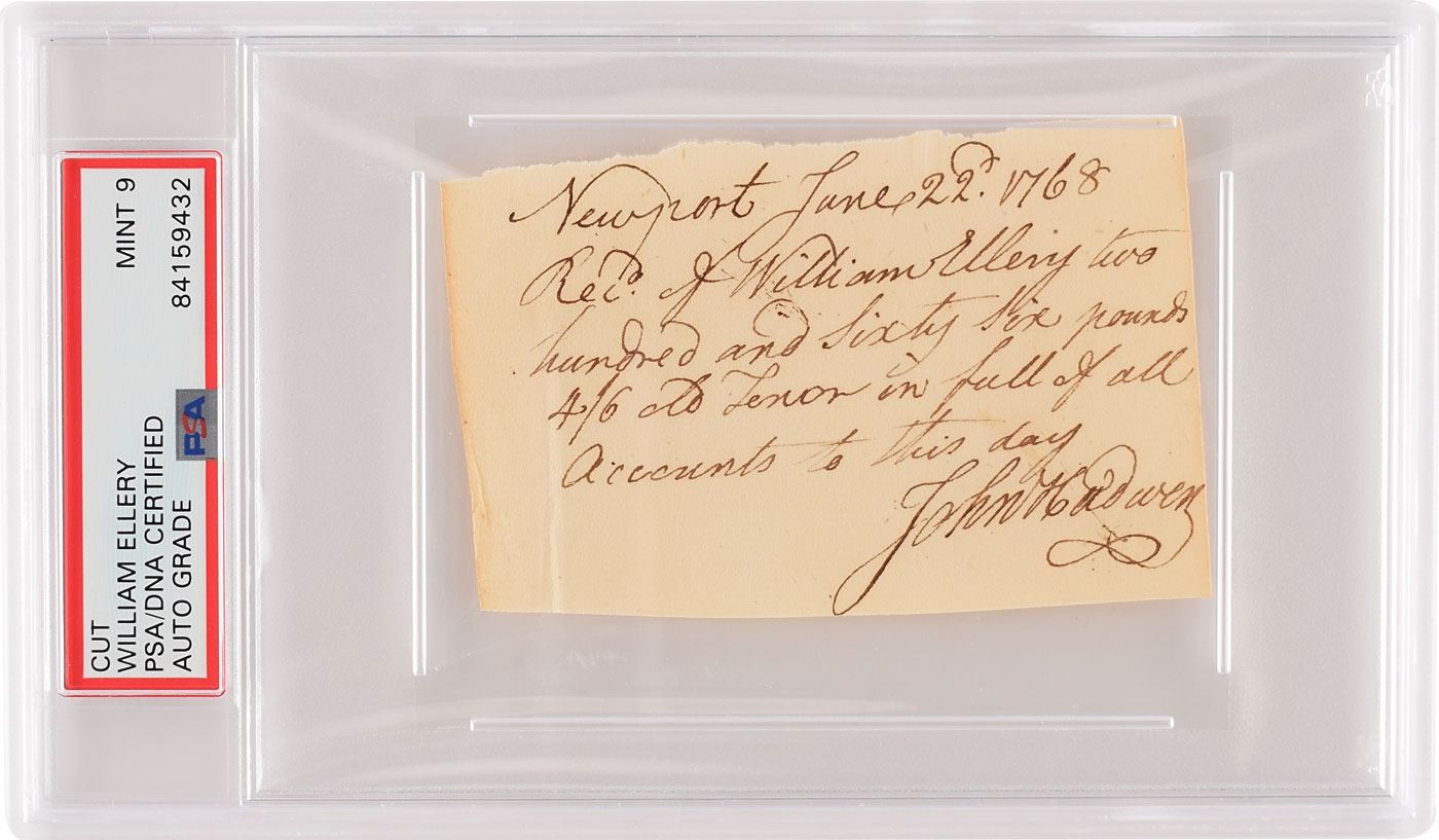 Third-person ADS, signed within the text, “William Ellery,” one page, 3.75 x 2.5, June 22, 1768. A short receipt, in full: "Newport June 22'd 1768, Rec'd of William Ellery two hundred and Sixty Six pounds 4/6 old Tenor in full of all Accounts." Signed at the conclusion by John Hadwen. In fine condition, with a light crease near the left edge. Encapsulated in a PSA/DNA authentication and grading holder, evaluating the autograph as "MINT 9."