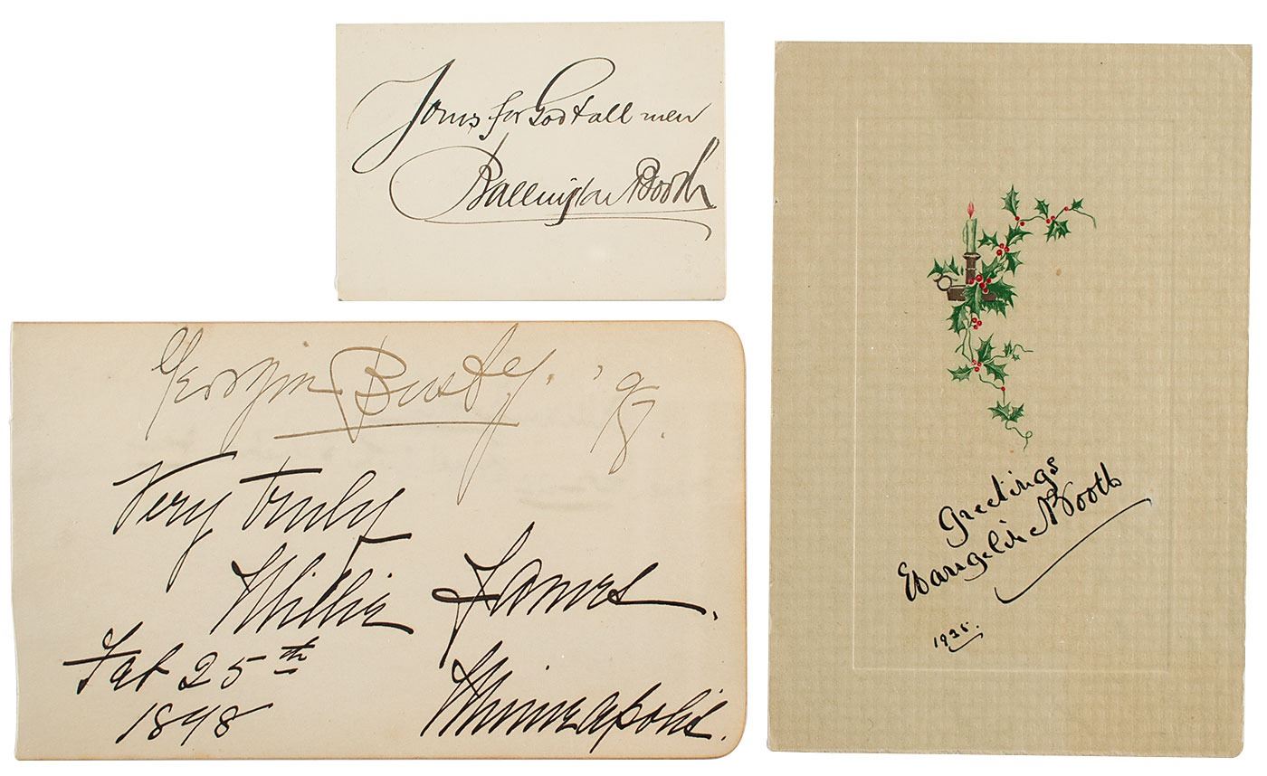 Uncommon fountain pen signatures of Salvation Army founders William, Evangeline, and Ballington Booth—"William Booth, General of the Salvation Army, March 22 98," "Greetings, Evangeline Booth, 1925," and "Yours for God & all men, Ballington Booth"—on individual sheets or cards ranging in size from 3.5 x 2.5 to 6.75 x 4. In overall fine condition, with show-through from unrelated signatures on the back of the William Booth page.