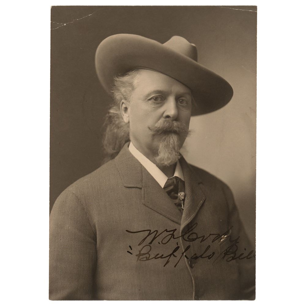 Vintage matte-finish 3.75 x 5.5 photo of the legendary Wild West figure, signed in fountain pen, "W. F. Cody 'Buffalo Bill.'" In fine condition, with a crease to each upper corner; the last letter in "Bill" is mostly missing because Cody didn't leave himself enough space. Accompanied by a full letter of authenticity from PSA/DNA. A desirable uninscribed and crystal-clear portrait of Buffalo Bill.
