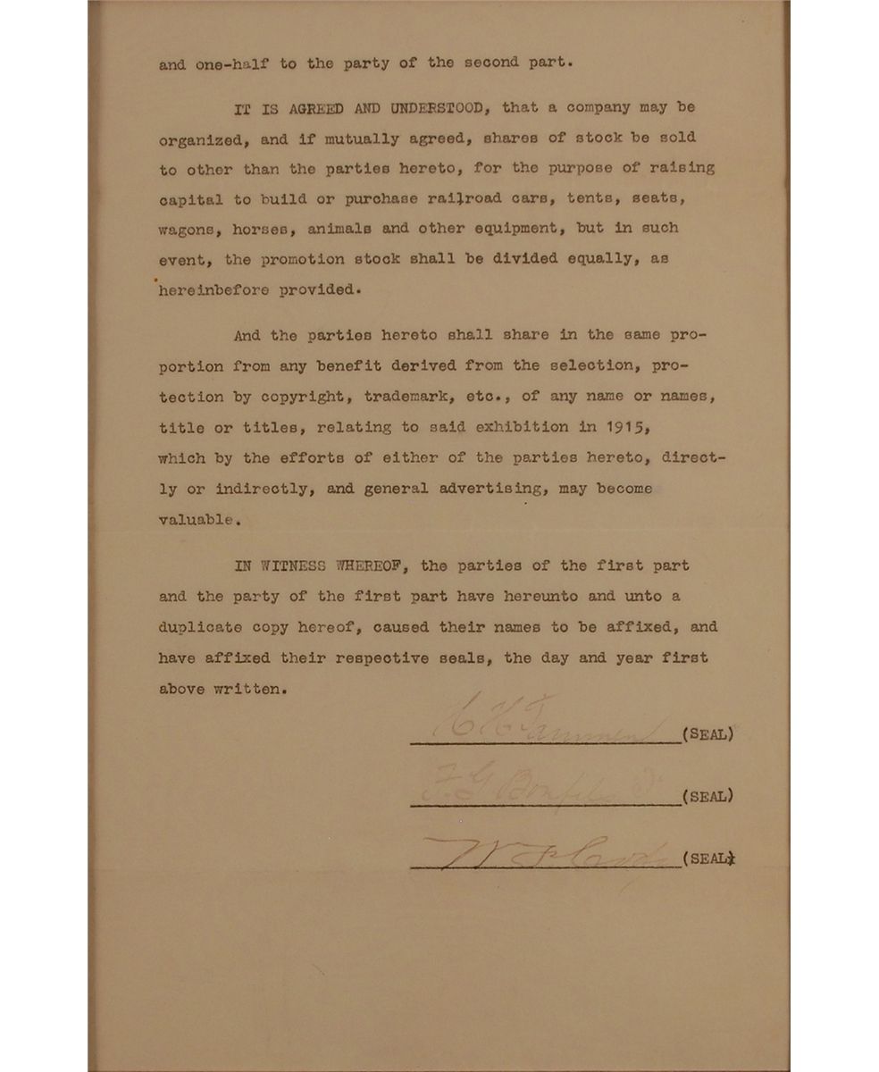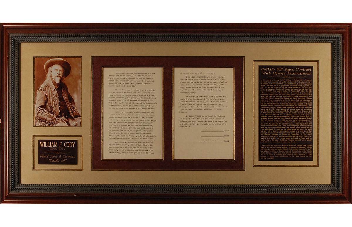 DS, signed “W. F. Cody,” two pages, 7.5 x 11.5, January 28, 1913. Agreement between Cody, Frederick Bonfils, and Harry Tammen to create a new show and share the profits evenly. In part: “The parties of the first part, as individuals and owners of The Denver Post and the Denver Weekly Post, are expending time and money in promoting an entertainment of national public interest…and the party of the second part is devoting time and money to the success of said enterprise…it is hereby mutually agreed that the parties to this agreement shall have such an enterprise in view…‘The Last Grand Council of the North American Indian’ and the pageant and pageants given in Denver in 1915 in connection with the Panama Pacific Exposition at San Francisco, the net profits from year to year are to be divided equally, one half to the parties of the first part and one half to the party of the second part…a company may be organized, and if mutually agreed, shares of stock to be sold to other than the parties herein.” Signed at the conclusion by Cody, Bonfils, and Tammen. Beautifully leather- and suede-matted and framed by the Gallery of History, with a portrait of Cody, a name plaque, and an informational plaque, to an overall size of 45 x 23. In fine condition, with Cody’s signature fairly light, but still completely legible. In dire financial need, Cody was forced to continue his career despite his plans to retire. Bonfils and Tammen had purchased the Sells-Floto Circus and sought to expand it with Cody. Unfortunately, Cody’s indebtedness continued through this production, requiring him to remain performing until his death. It was contracts like these that caused the split later in 1913 with his longtime partner Gordon W. ‘Pawnee Bill’ Lillie. Oversized.