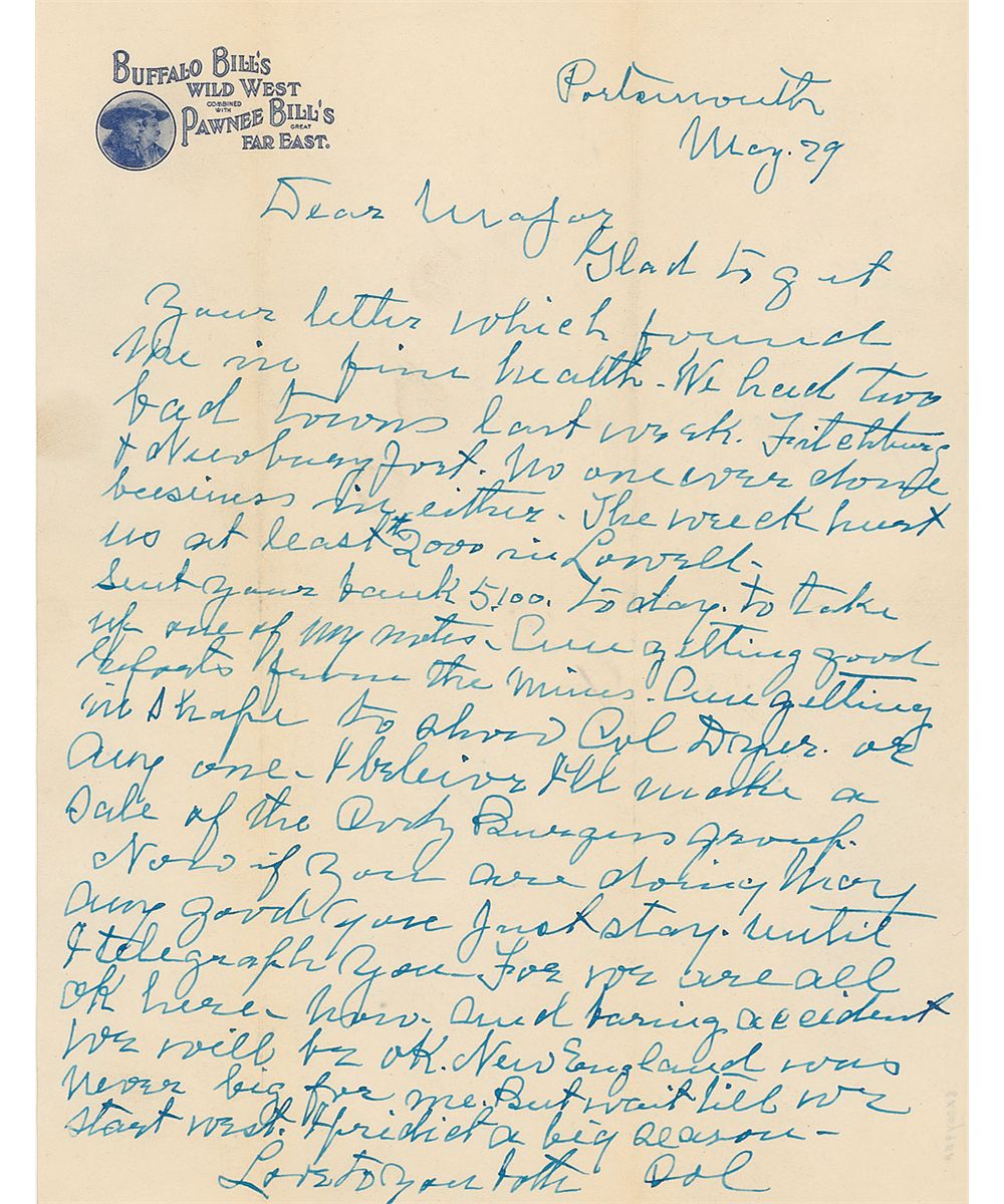 ALS signed “Col.,” one page, 8.5 x 11, illustrated Buffalo Bill’s Wild West Show letterhead, Portsmouth, May 29, [1911]. Letter to G. W. Lillie, otherwise known as ‘Pawnee Bill.’ In part: “We had two bad towns last week. Fitchburg & Newburyport. No one ever done business in either. The week hurt us at least $2000 in Lowell—sent your bank 5100 today to take up one of my notes…We are all OK here—now. And barring accident we will be OK. New England was never big for me. But wait till we start west. I predict a big season.” In fine condition, with intersecting folds and a subtle spot of toning to the left border.