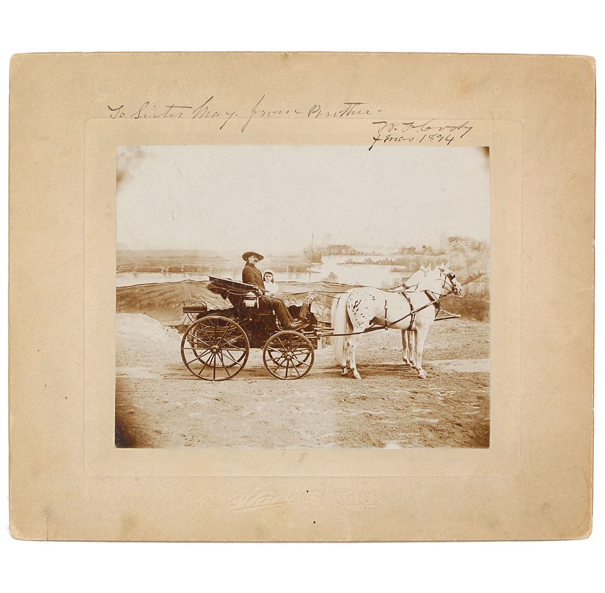 Exceptional 9.5 x 7.5 photo of Cody and his daughter Irma in a horse-drawn carriage, affixed to the original 14.75 x 12.25 photographer’s mount, signed and inscribed at the top of the mount in black ink, “To Sister May, from Brother, W. F. Cody, Xmas 1894.” Scattered surface marks, a small tear to the lower left corner of the mount, and scattered dings and soiling to mount, otherwise fine condition. The image was captured by the Stacy studio of Brooklyn with the Codys posed in front of a hand-painted Wild West Show arena backdrop at Ambrose Park, where he performed from May 12, 1894, through October 1894. This mounted portrait descended directly through the Cody family, inherited by his great-granddaughter and given on loan to the Buffalo Bill Historical Center of the West for most of the last half of the 20th century. Mary Hannah ‘May’ Cody was Buffalo Bill’s youngest sister, who was responsible for selecting his burial site atop Lookout Mountain. A rare oversized photo with an excellent intimate personal association.