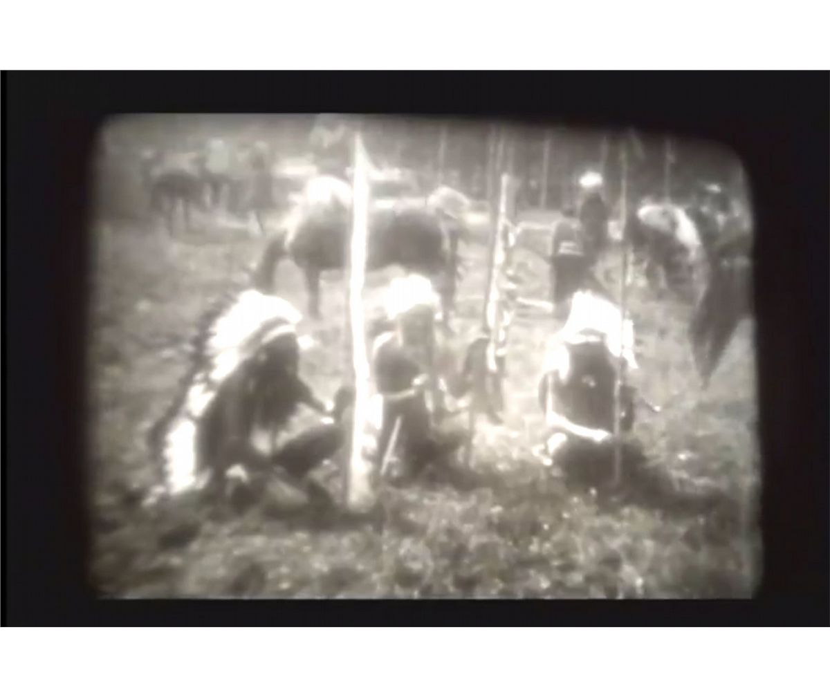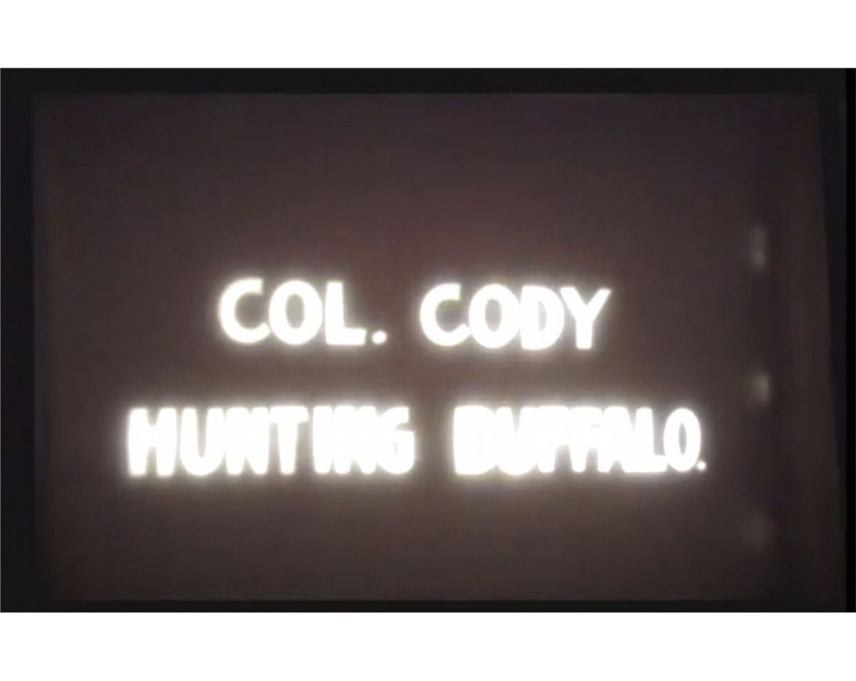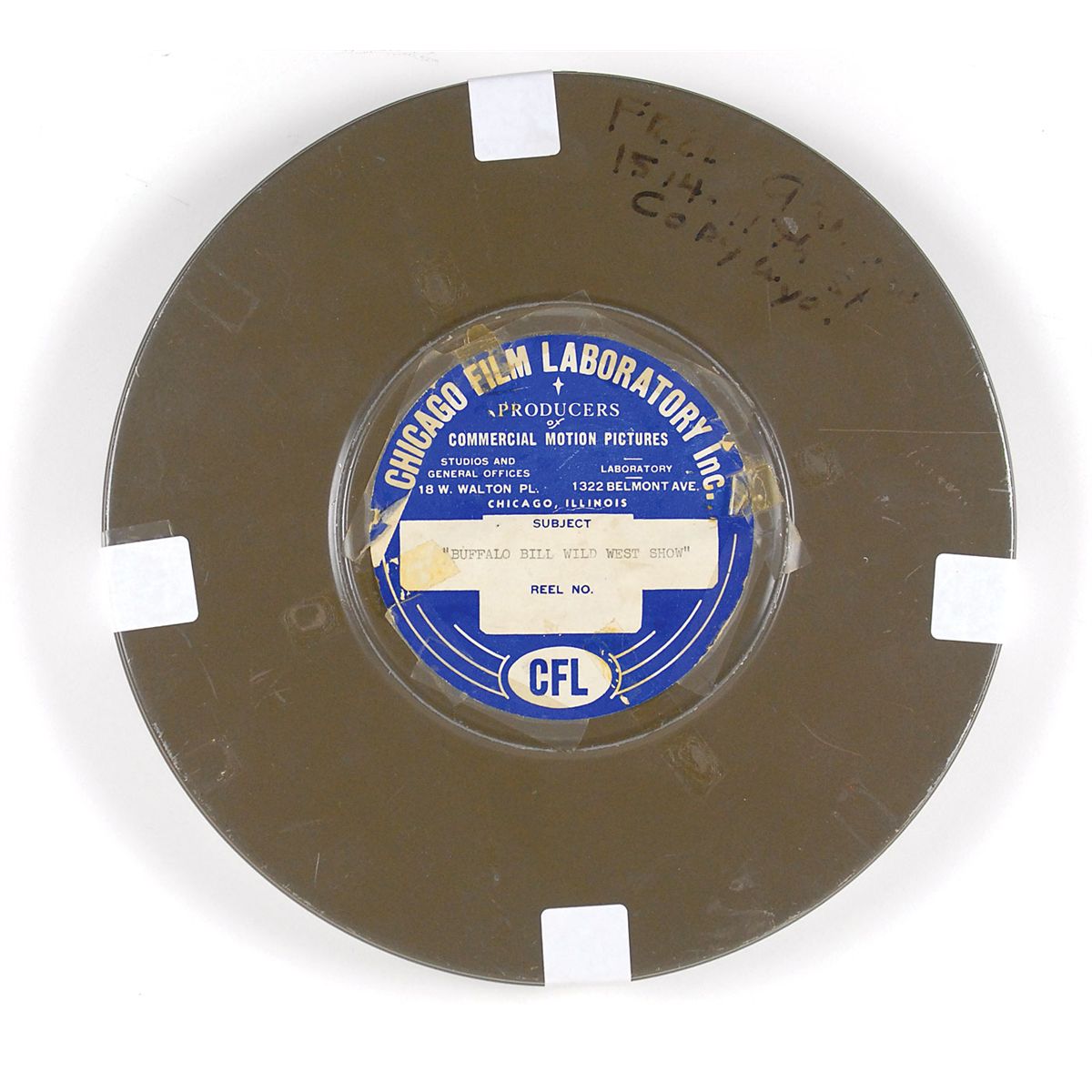 Amazing second-generation 16mm film of the Buffalo Bill Wild West Show. Single roll of silent black-and-white film is stored on one 10.5? diameter reel with a running time of 29:30. Most likely filmed in Philadelphia, Pennsylvania, in 1907–1908, this film is shot from an audience member’s perspective very close to the action. Film contains 12 separate acts from the show, each introduced with a title card, including displays of horsemanship and marksmanship, dramatic battle re-enactments, and Native Americans in elaborate costumes. Opening title card reads, “Buffalo Bill's Wild West Show / Copyright No. 1, Unpublished 2976 / June 22, 1950," and the acts introduced include: “Grand Review,” “Johnny Baker Champion Marksman,” “Col. Cody Hunting Buffalo,” “Col. Cody on Horseback Shooting Glass Balls,” “Football on Horseback Indians vs. Cowboys,” and “Final Review.” In fine condition. Accompanied by a digital copy of film made by using a digital camera to record the film as it plays.