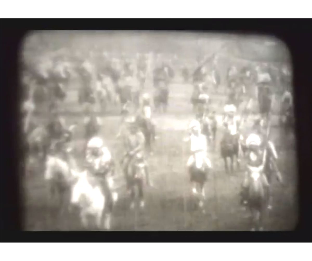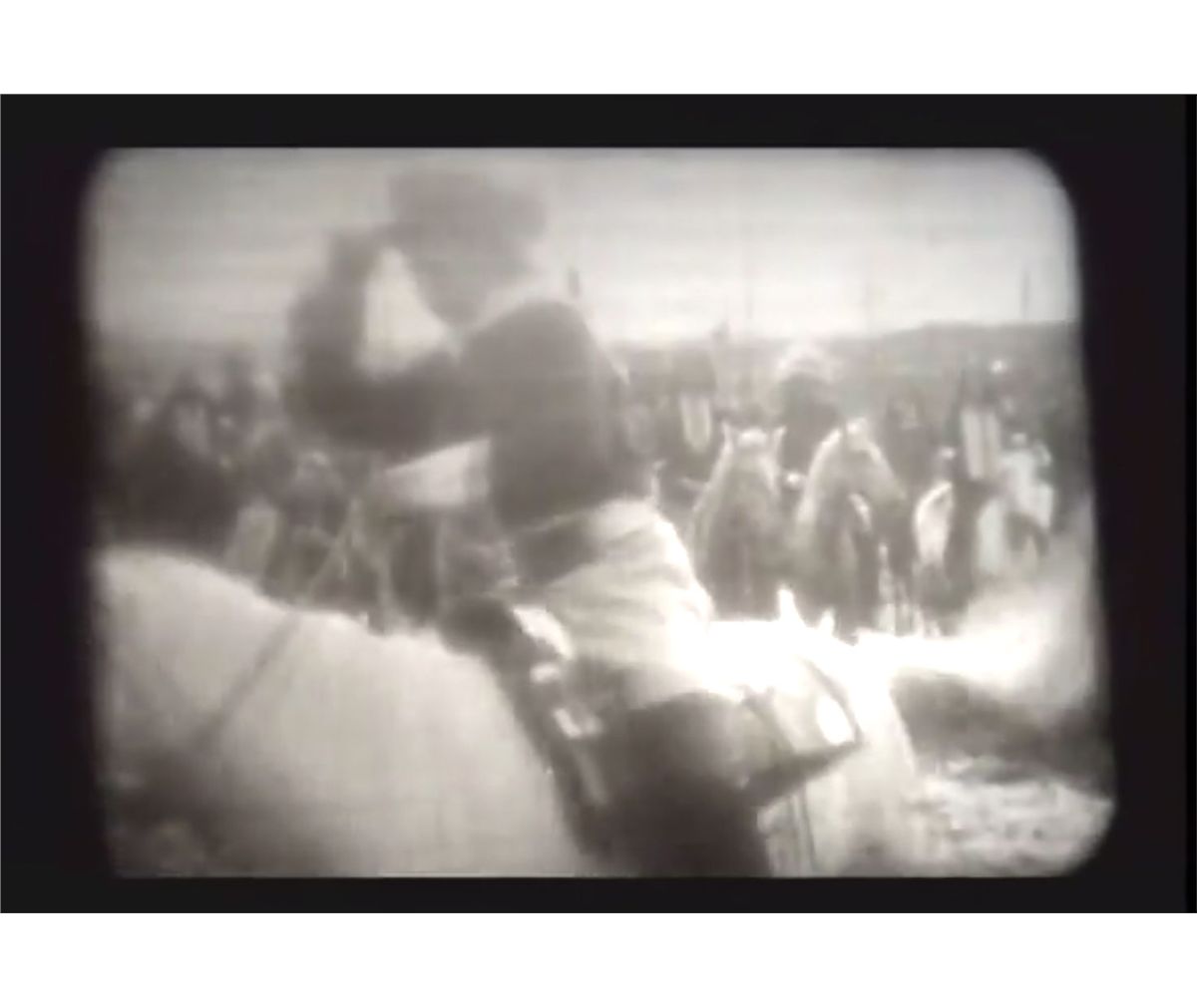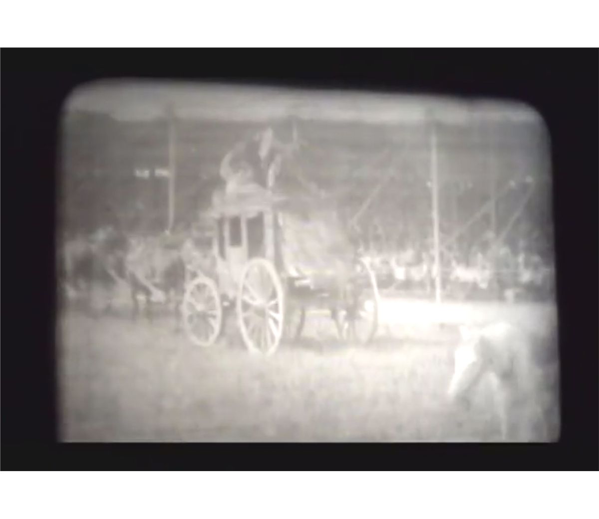 Amazing second-generation 16mm film of the Buffalo Bill Wild West Show. Single roll of silent black-and-white film is stored on one 10.5? diameter reel with a running time of 29:30. Most likely filmed in Philadelphia, Pennsylvania, in 1907–1908, this film is shot from an audience member’s perspective very close to the action. Film contains 12 separate acts from the show, each introduced with a title card, including displays of horsemanship and marksmanship, dramatic battle re-enactments, and Native Americans in elaborate costumes. Opening title card reads, “Buffalo Bill's Wild West Show / Copyright No. 1, Unpublished 2976 / June 22, 1950," and the acts introduced include: “Grand Review,” “Johnny Baker Champion Marksman,” “Col. Cody Hunting Buffalo,” “Col. Cody on Horseback Shooting Glass Balls,” “Football on Horseback Indians vs. Cowboys,” and “Final Review.” In fine condition. Accompanied by a digital copy of film made by using a digital camera to record the film as it plays.