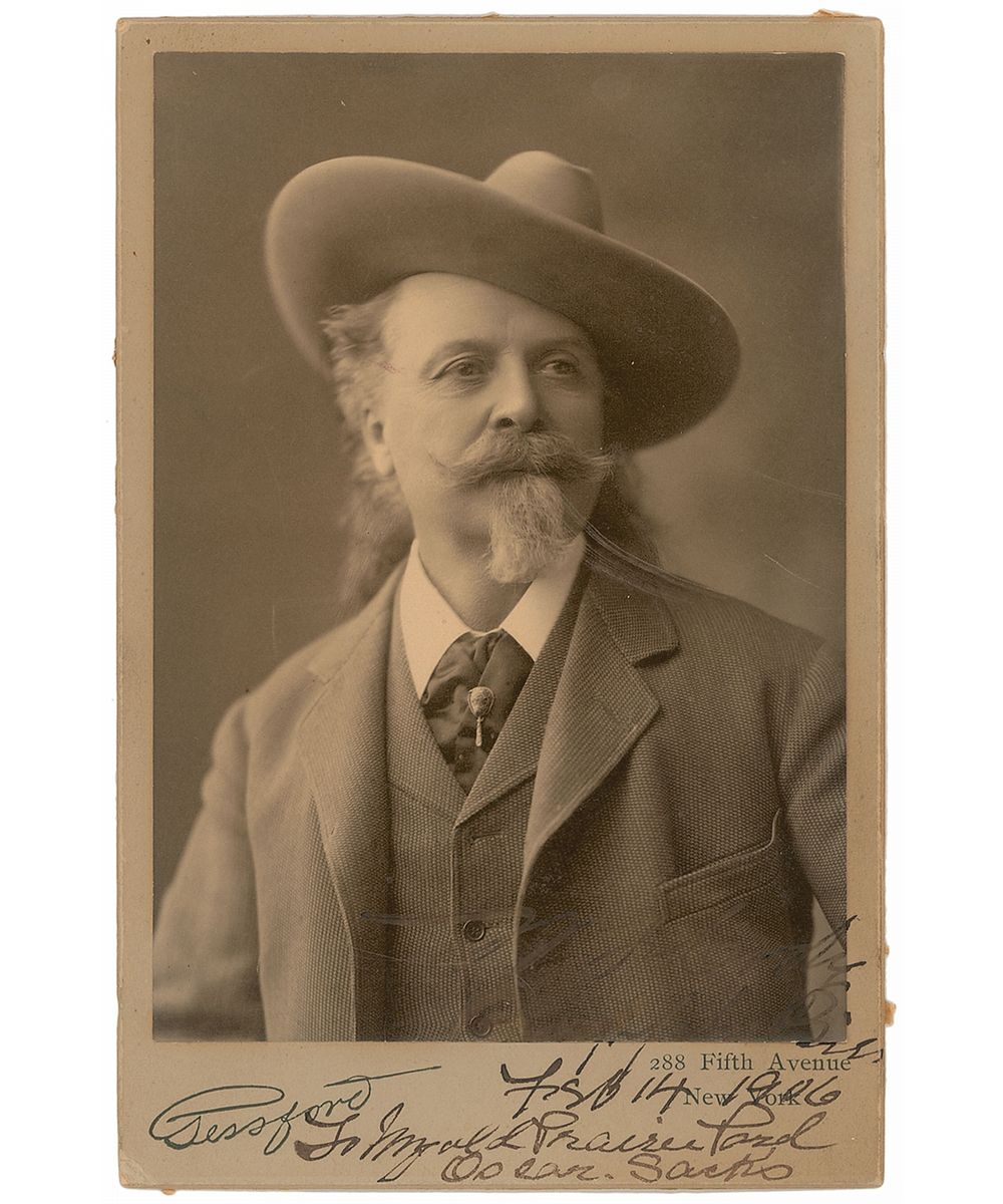Handsome 4.25 x 6.5 cabinet photo of Cody in dapper Western attire, signed and inscribed at the bottom of the image, “W. C. Cody, Buffalo Bill, Feb. 14, 1906, to my old Prairee Pard, Oscar Sacks.” Published by Pessford of New York. Poor contrast to the signature against the darker background, and a few trivial surface marks and edge dings, otherwise fine condition. Sacks was an early American Indian fighter, western frontiersman, scout, and friend of Buffalo Bill—a friendship made clear by this warm inscription. Although the signature is light, this cabinet card presents a fabulous, crystal-clear image of Cody and is enhanced by its association with his ‘prairie partner.’