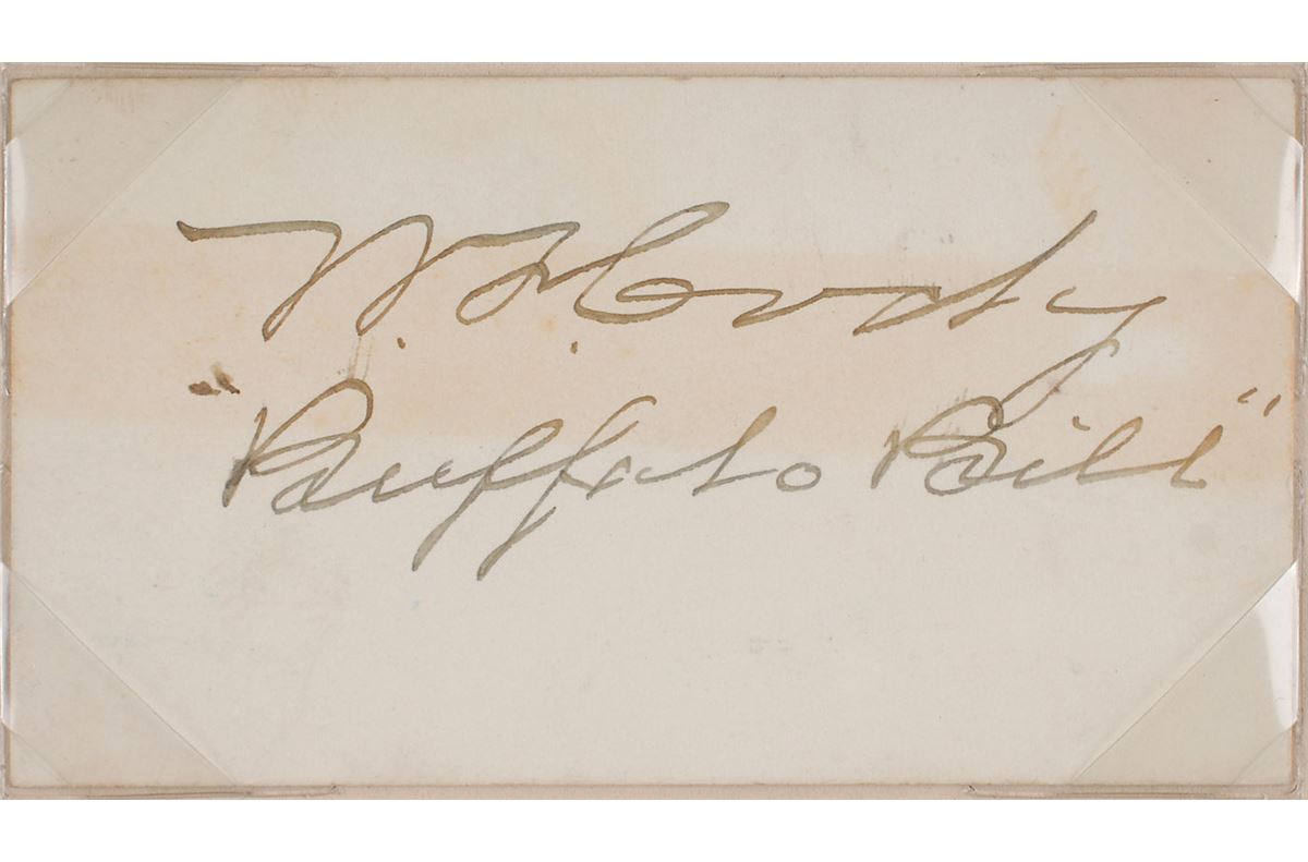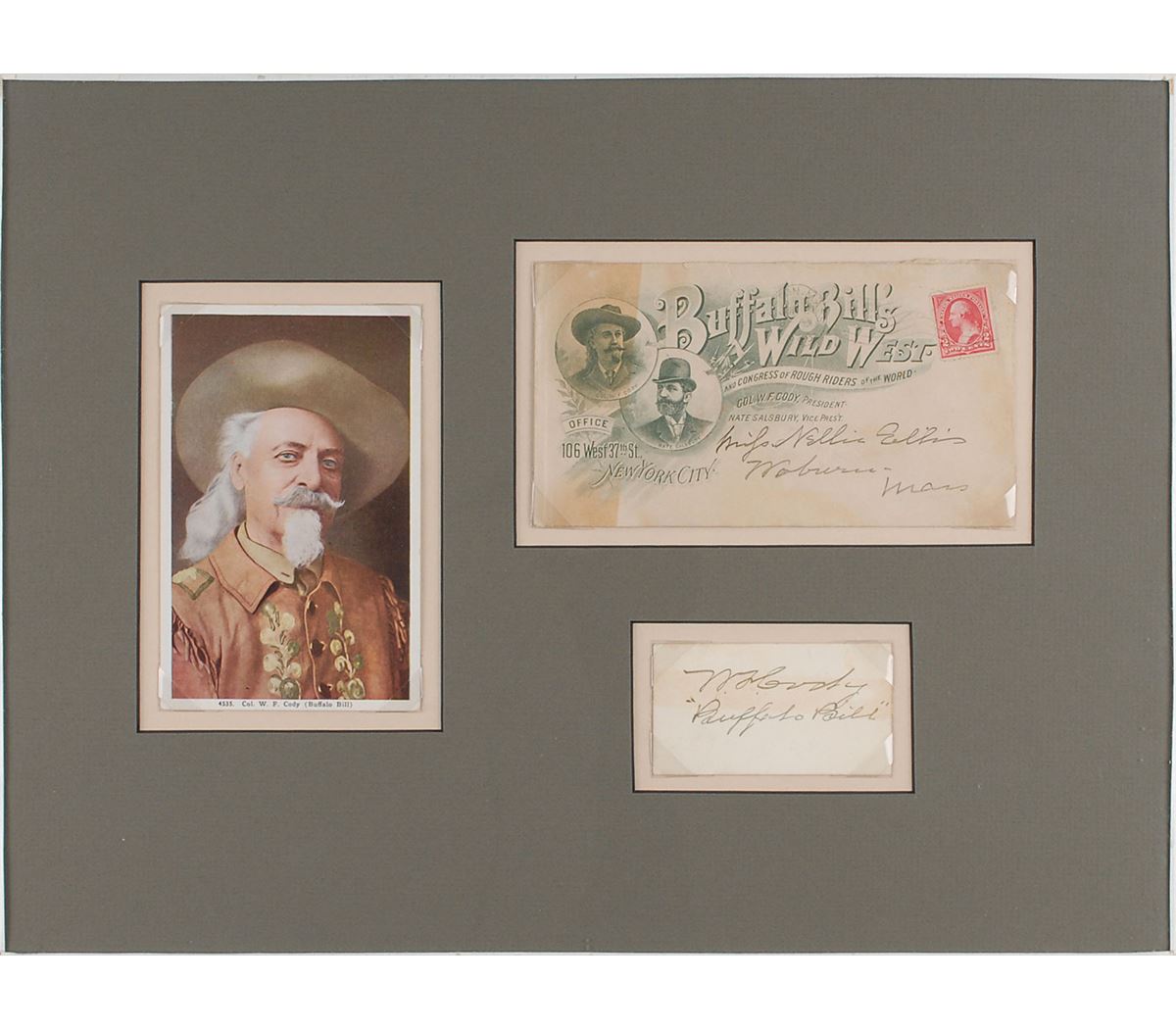 Ink signature, “W. F. Cody, ‘Buffalo Bill’,” on an off-white 3.25 x 1.75 card, with an ornate envelope addressed in Cody's hand, “Miss Nellie Ellis, Woburn, Mass." Matted together beside a color postcard of Cody to an overall size of 16 x 12. In very good condition, with a band of toning passing through the signature.