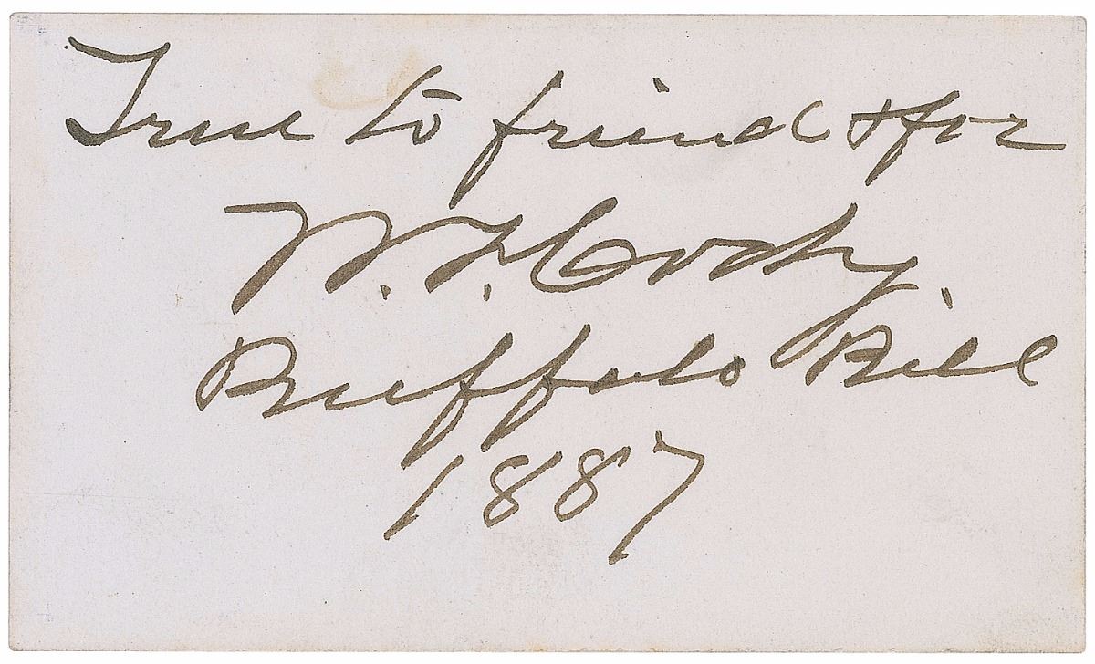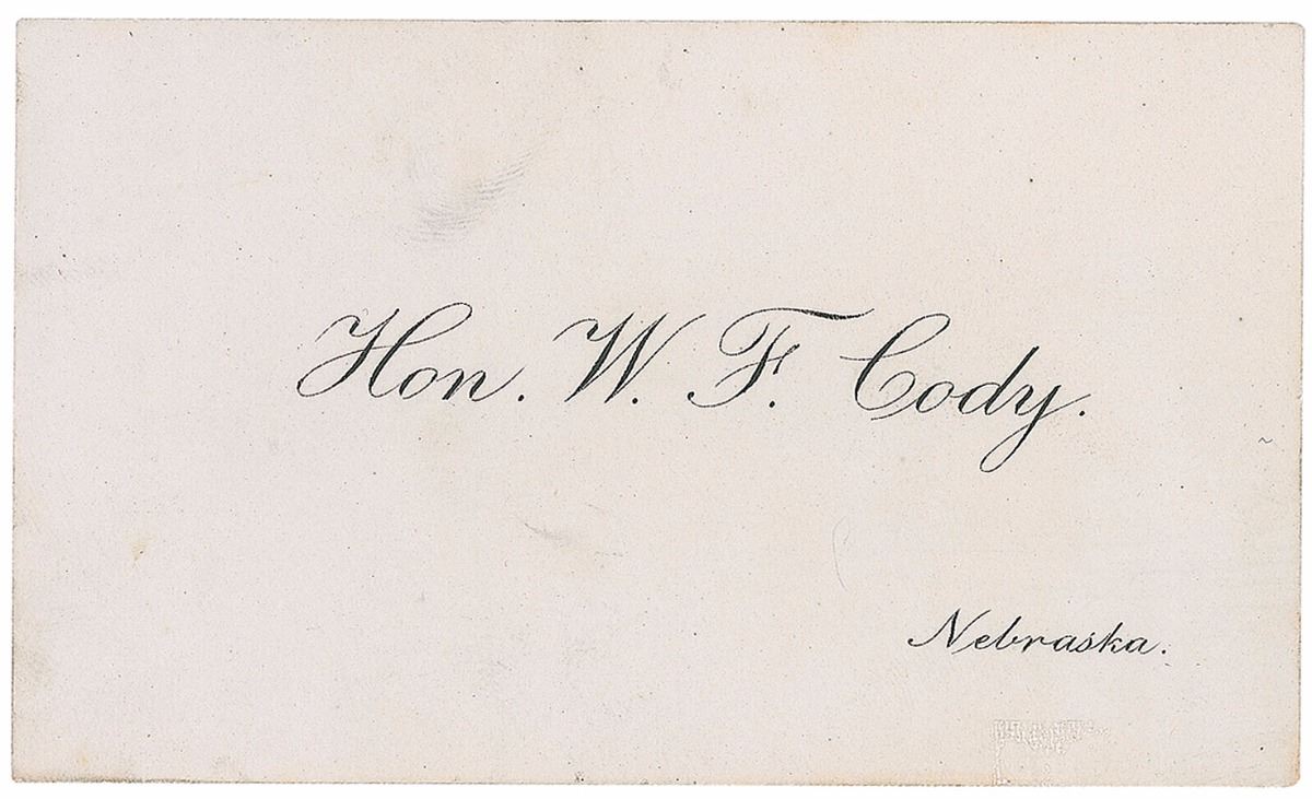 Cody’s personal calling card, 3.5 x 2, signed on the reverse in black ink, “True to friend & foe, W. F. Cody, Buffalo Bill, 1887.” In fine condition, with a trivial spot of soiling to top edge and trivial spots of adhesive remnants to printed side.