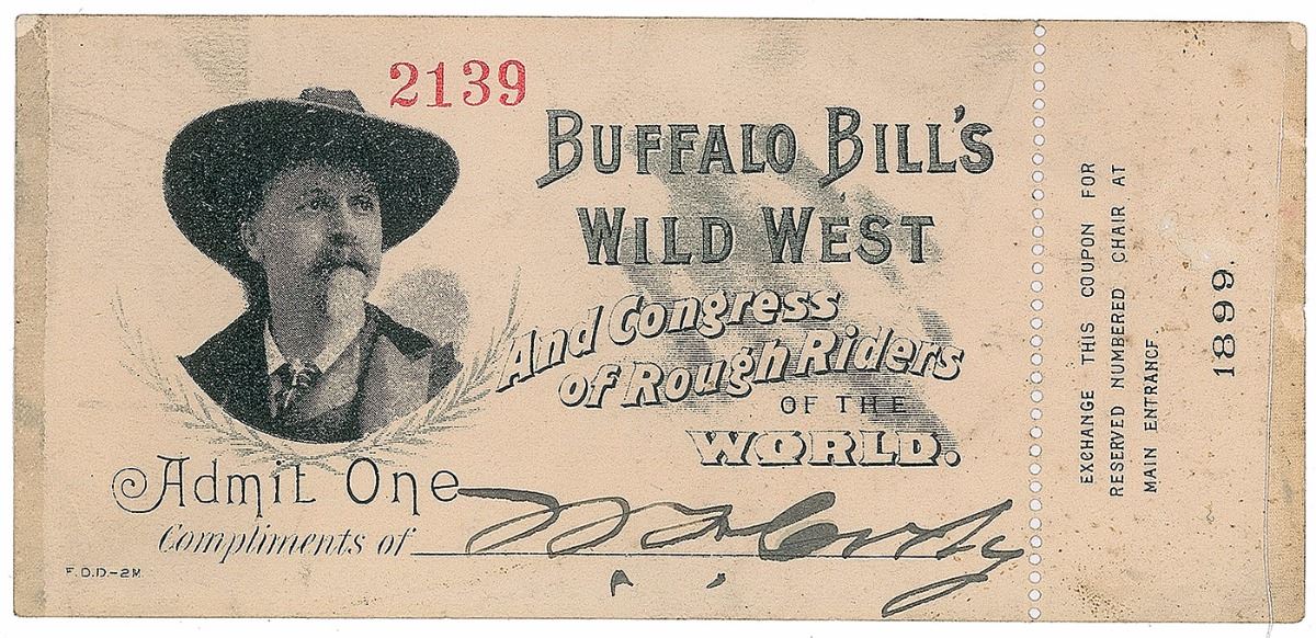 Rare unused complimentary ticket for admission to the 1899 show Buffalo Bill’s Wild West and Congress of Rough Riders of the World, 4.75 x 2.25, neatly signed in ink, “W. F. Cody.” The ticket features an outstanding portrait of Cody on the left side and ornate text. In fine condition, with thin strips of adhesive along right and left edges. A highly appealing and rarely seen format.