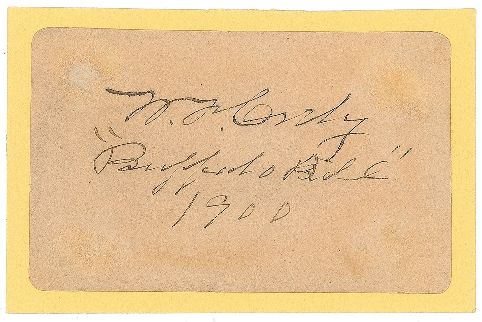 Desirable ink signature, "W. F. Cody, 'Buffalo Bill,' 1900,” on an off-white 4 x 2.5 sheet affixed to a slightly larger mount. In very good to fine condition, with light staining and toning.