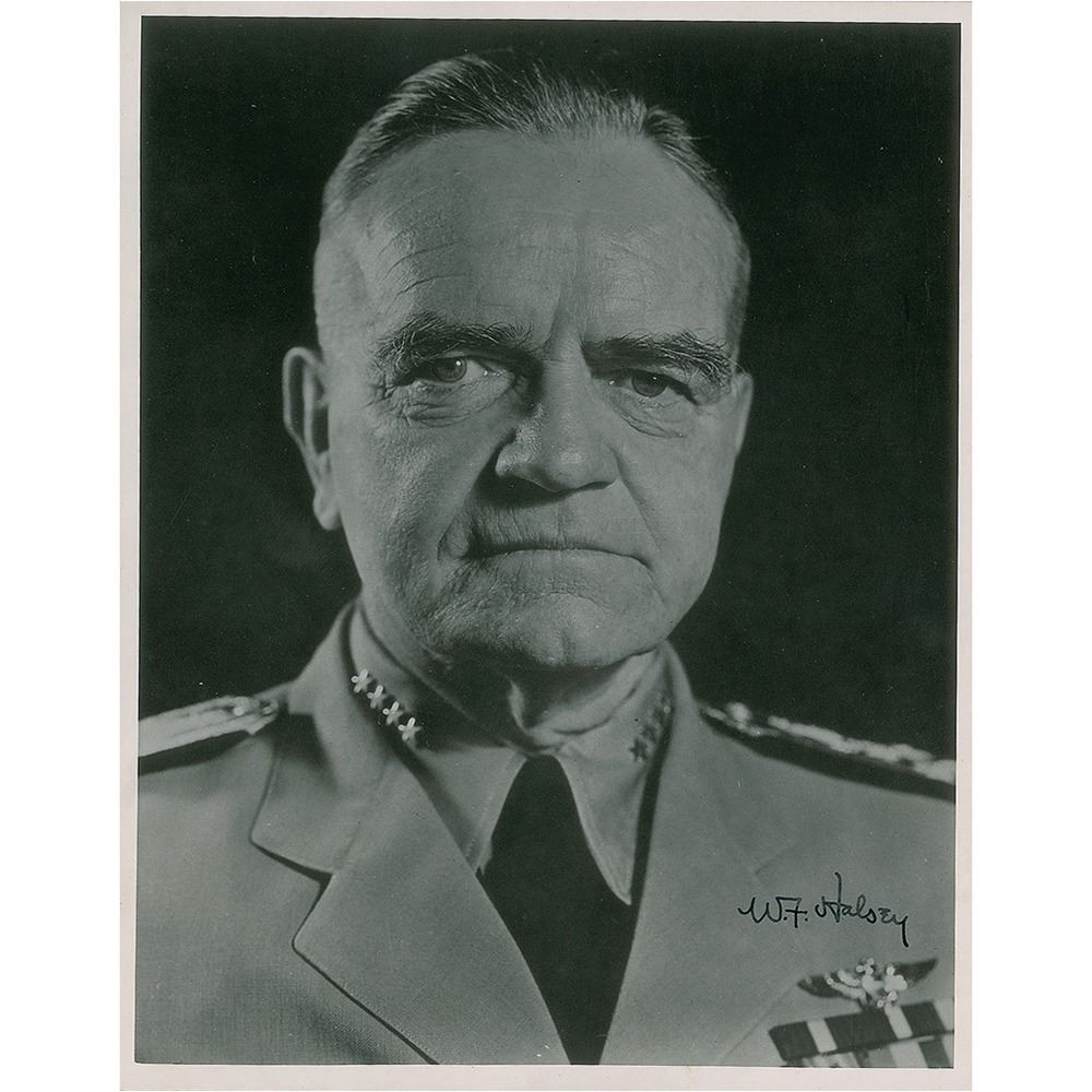 Vintage matte-finish 8 x 10 photo of Admiral William Halsey wearing his uniform in an up-close pose, signed in fountain pen, "W. F. Halsey." Collector's notation to reverse dates the autograph to February 28, 1946. In fine condition, with rippling to the side edges.