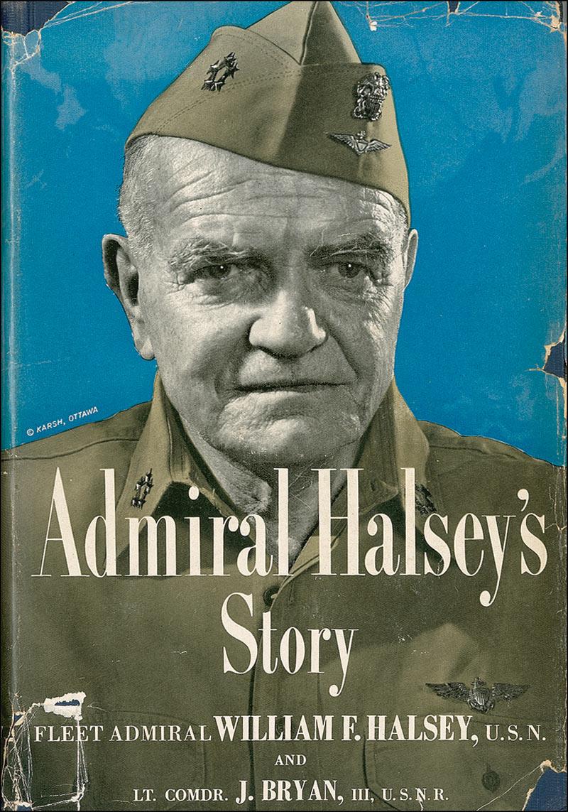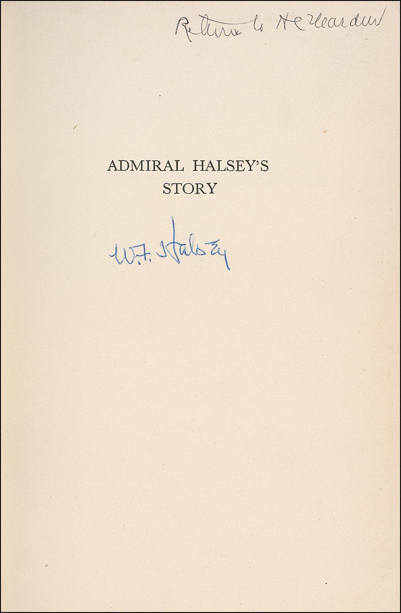 Admiral (1882–1959) who commanded the Third Fleet in the Pacific Theater during World War II. Signed book: Admiral Halsey’s Story. Later printing. NY: McGraw-Hill, 1947. Hardcover with dustjacket, 6.25 x 9.25, 310 pages. Signed on the half-title in blue ballpoint, “W. F. Halsey.” Ink notation to signed page, owner’s signature to second free end page, small label affixed to first free end page, otherwise fine condition. Dustjacket exhibits scattered paper loss, scattered tears and creases, and light soiling.