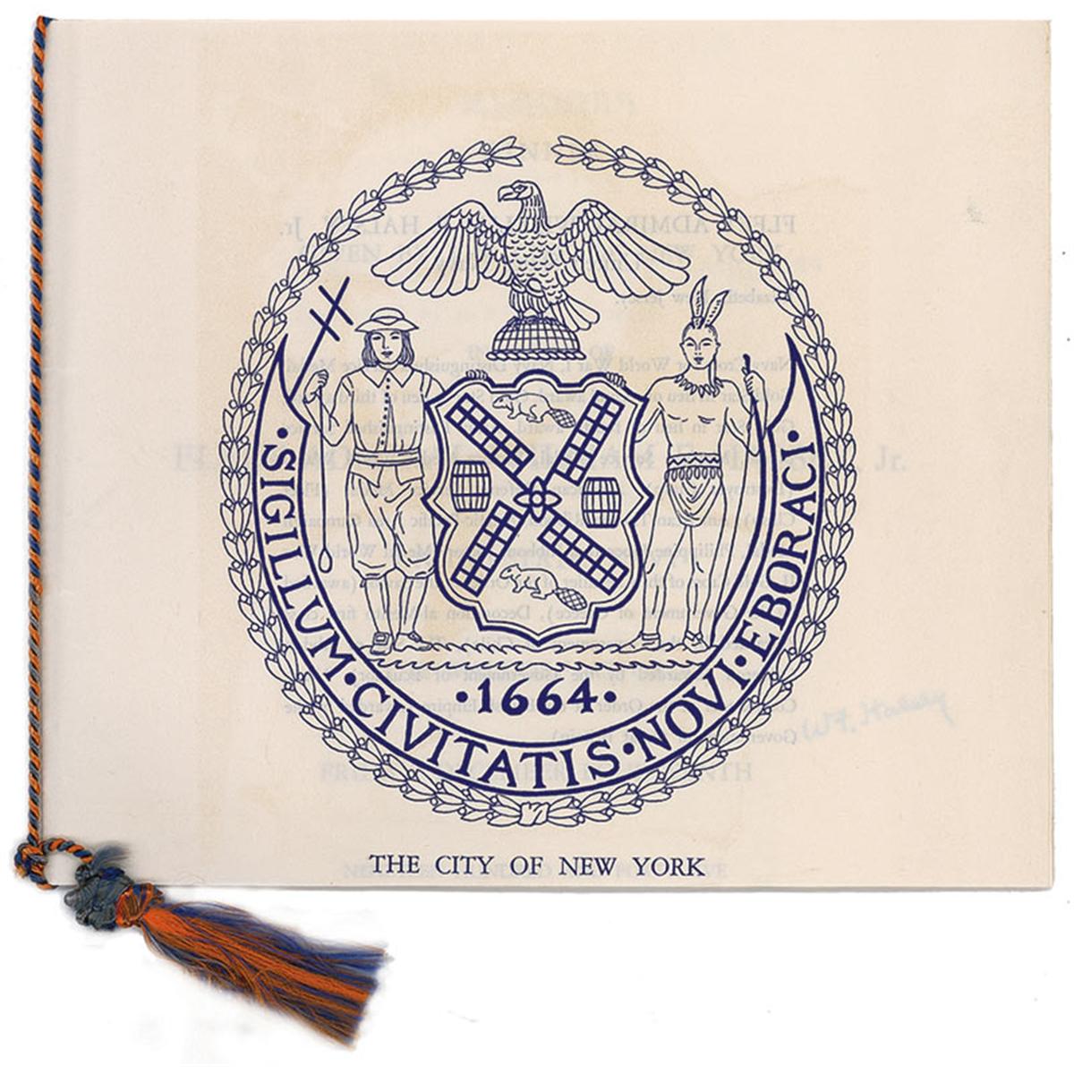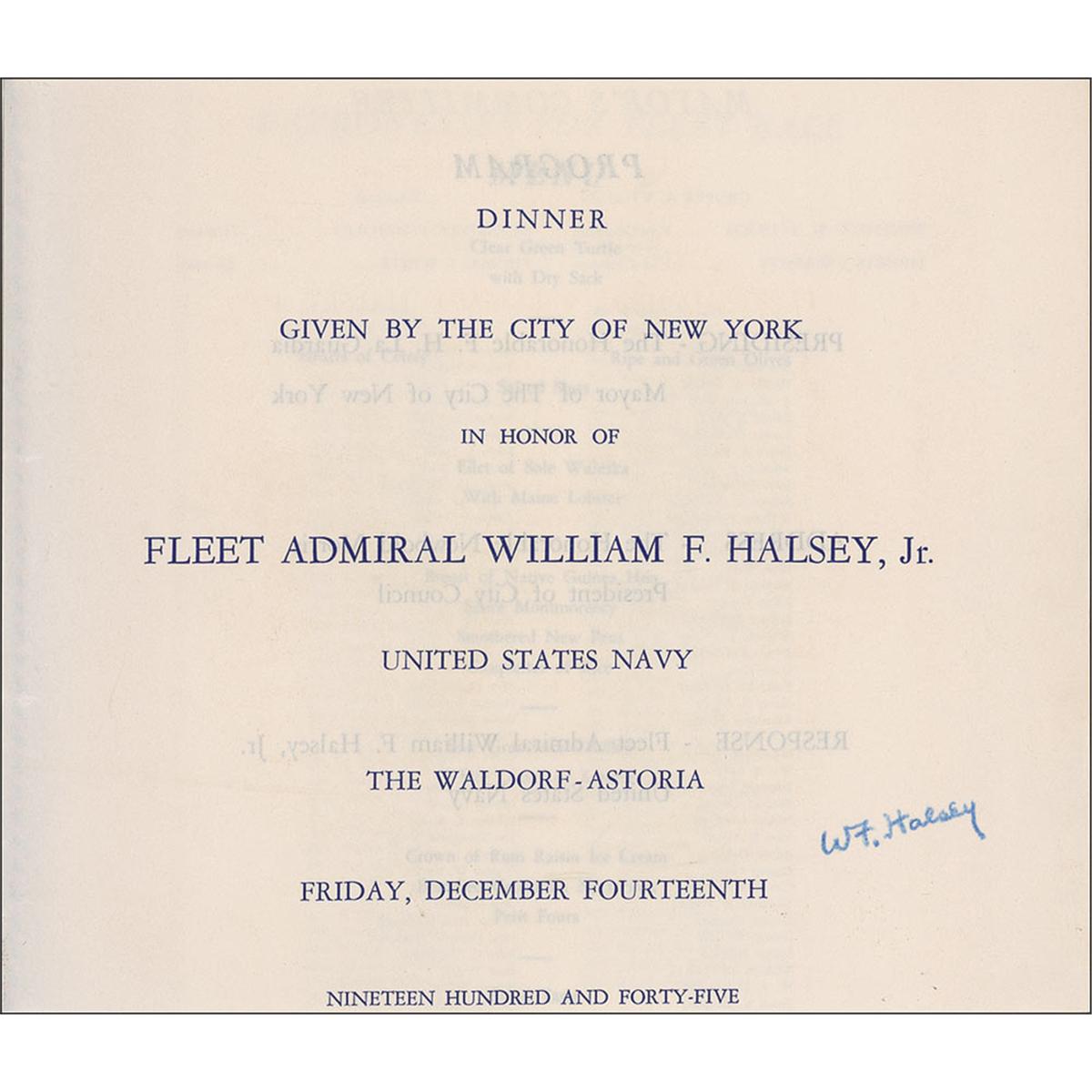Admiral (1882–1959) who commanded the Third Fleet in the Pacific Theater during World War II. Program for a dinner in Halsey’s honor by the city of New York at the Waldorf-Astoria on December 14, 1945, 9.25 x 8, signed inside on the first page in blue crayon. In fine condition, with some mild toning to cover, small tape remnant to tassel, and small portion of tassel missing.
