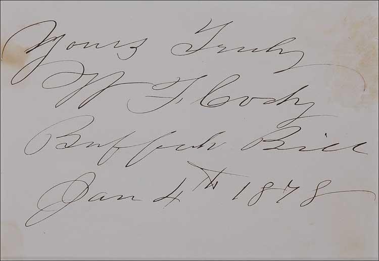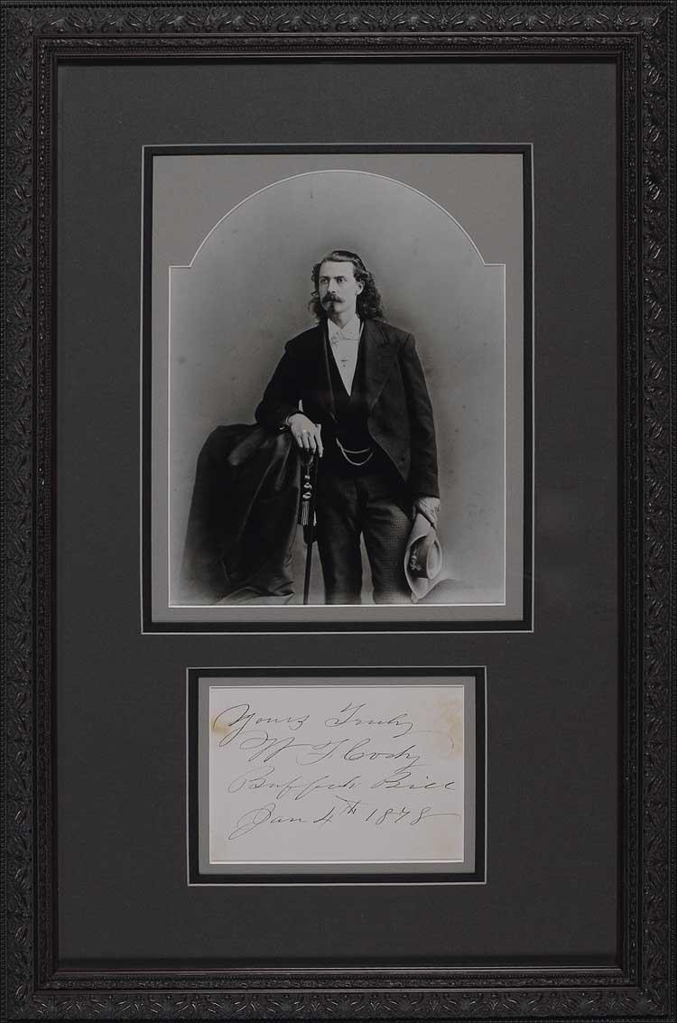 Large and clear ink signature, “Yours truly, W. F. Cody, Buffalo Bill, Jan. 4th, 1878,” on an off-white 5.5 x 4 album page. Triple matted and framed with a handsome portrait of a young Cody, to an overall size of 14.5 x 22. Four areas of light toning from adhesive on reverse, otherwise fine condition. Pre-certified PSA/DNA and RRAuction COA.