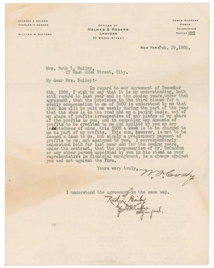 TLS signed “W. F. Cody,” one page, 8.5 x 11, Offices of Holmes & Rogers Lawyers letterhead, February 29, 1908. Letter to the widow of circus founder James A. Bailey, now his partner in Buffalo Bill’s Wild West and Congress of Rough Riders of the World. In full: “In regard to our agreement of December 6th, 1906, I wish to say that it is my understanding, both with regard to last year and to the coming years, under that agreement, that the provision in the third clause for a weekly compensation to me of $500 is understood by me that that sum will be paid me weekly during the part of the year that the show is on the road and on a paying basis, out of my share of profits irrespective of any pledge of my share of the profits to you, and in computing any amounts of profits to be credited to me and applied by you on any indebtedness of mine, this $500 a week is to be charged to me as part of my profits. This sum, however, is not to be deemed a loan to me, but simply a preliminary payment of profits to me, not assigned to you. I correspondingly understand both for last year and for the coming years, under the contract, that the compensation of Mr. McCaddon or any other person appointed by you in his stead as your representative in financial management, is a charge against you and not against the firm.” The statement typed beneath Cody’s letter, “I understand the agreement in the same way,” is signed in Ruth Bailey’s name by her brother, James T. McCaddon, business manager of Barnum and Bailey, as attorney in fact.