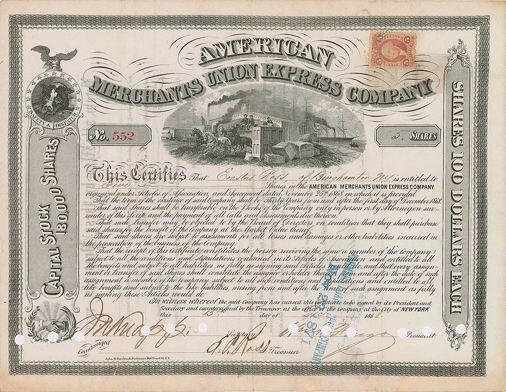 Partly-printed DS, signed “Wm. G. Fargo,” one page, 12.25 x 9.5, December 15, 1868. Certificate for 5 shares of stock in the American Merchants Union Express Company issued to Erastus Ross, of Binghamton, New York, signed at the conclusion by Fargo as president of the company, and countersigned by E. P. Ross as treasurer and J. N. Knapp as secretary. In fine condition, with punched cancellation holes affecting the signature.