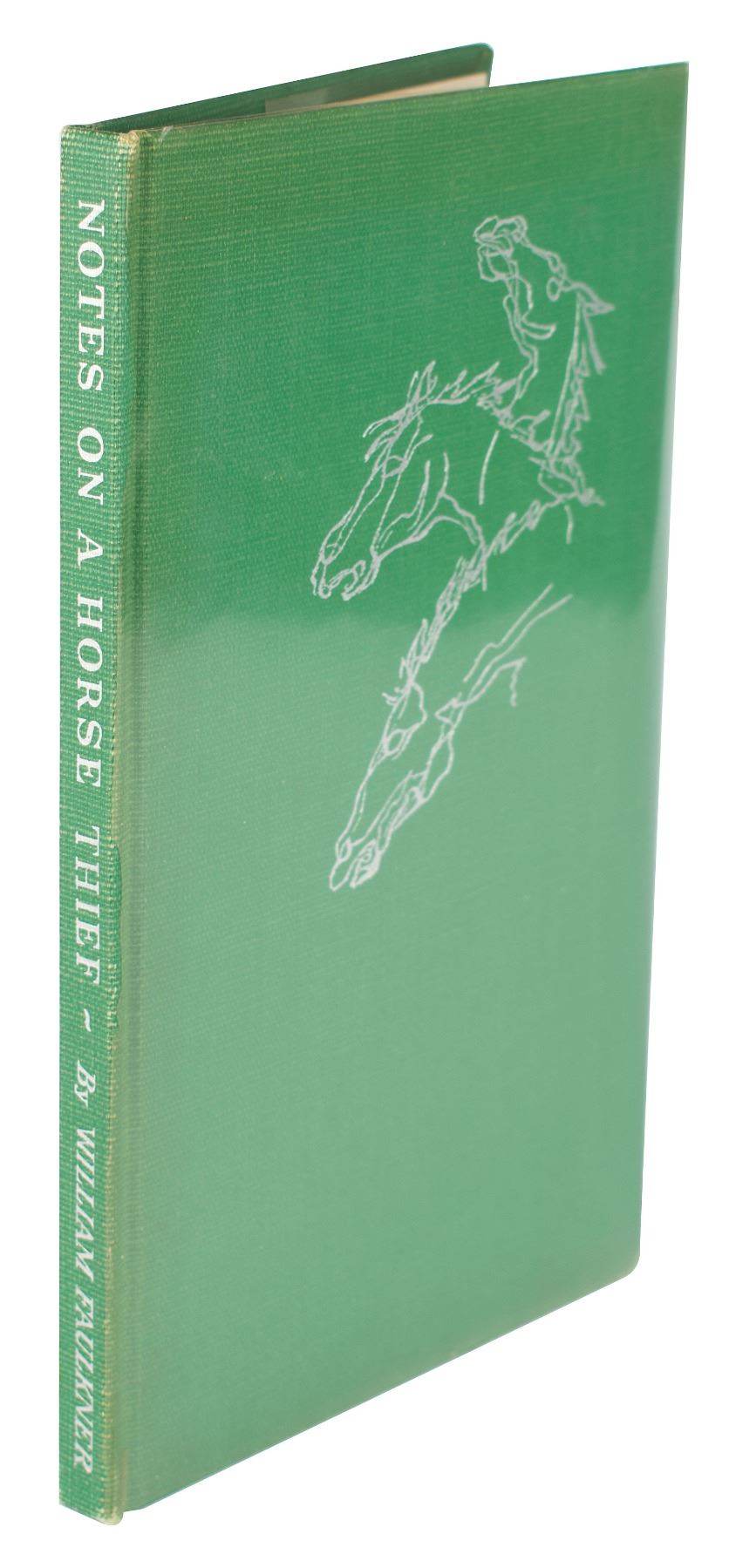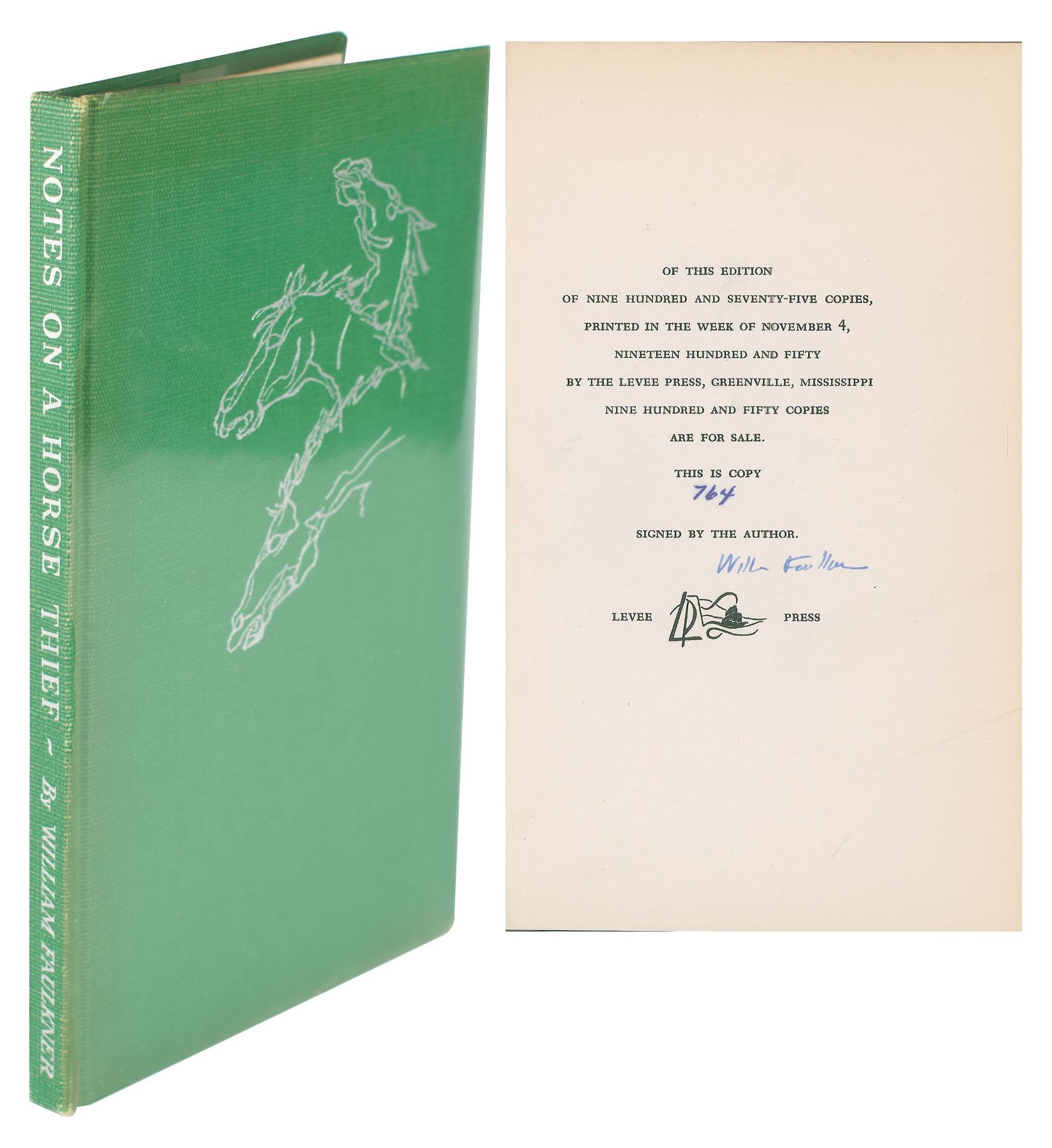 Signed book: Notes on a Horse Thief. First edition, limited issue, numbered 764/975. Greenville, MS: Levee Press, 1950. Hardcover, 6 x 9.5, 71 pages. Signed on the colophon in fountain pen, "William Faulkner." Autographic condition: fine. Book condition: VG+/None, with light rubbing to spine.