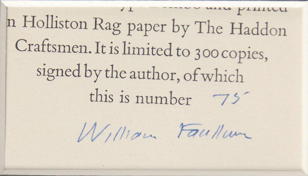 Ink signature, “William Faulkner,” on an off-white slip clipped from a limitations page of one of his books. Double matted and framed with a glossy portrait of Faulkner to an overall size of 15 x 18. In fine condition.